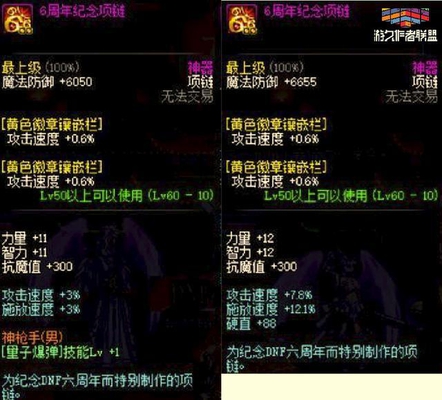 很多玩家错过了五周年的金手镯都非常的后悔,那么六周年的时候可以说是第一次开放周年纪念首饰套装的了,其中手镯跟戒指跟五周年一样,分为青铜,白银和黄金三个版本,每个版本对应一个相应的等级:10级、40级、60级。 手镯跟五周年的属性一样增加物理和魔法伤害,最高依旧是9%;戒指属性是增加魔法暴击率和物理暴击率,最高6%。 六周年纪念装备中,项链是一大亮点,很多人有了手镯戒指但是没有项链,主要是项链的获取方法是6月21日的整点在线中获取。为什么说项链是亮点呢,因为增加攻击速度和施放速度,当进入决斗场后的攻击速度高达7.8%的,这属性我现在用9周年的项链进去都达不到。 同时六周年的套装属性是增加30点的体力和精神以及2%的攻速和施放、5%的移动速度,也是第一套装出现的周年首饰。 七周年