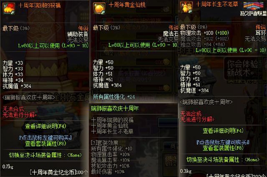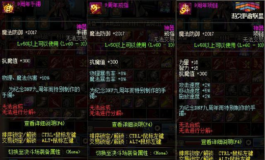 八周年和九周年的的周年纪念首饰属性是一样的: 手镯的物理魔法伤害提升10%,比往年的伤害提升了一些;戒指双暴提升到了8%,比往年提升了2%;项链,基础属性提升,三速与往年一致。 套装属性均为40点的体力和精神以及三速的提升。总体来说对小号的提升搬砖非常的实用。圣物套搭配这三件还是很舒服的。 十周年