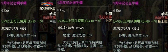 五周年的首饰是纪念手镯,分为三个级别的:铜手镯增加3%的物理/魔法伤害;银手镯增加5%的物理/魔法伤害;金手镯提升9%的物理/魔法伤害。 在那个时候,这个金手镯的属性可以说非常的强,并且与当时最强的史诗无影剑,魂链等都是不会冲突的,这个伤害是黄字伤害,所以与其他黄字伤害的装备是冲突了。 虽然这个手镯在当时周年庆被大家苦苦追求,但是获取的方法是比较难的,燃放五周年的爆竹后随机获得,所以当时不知道大家有没有看到满城都是燃放爆竹的勇士? 六周年首饰