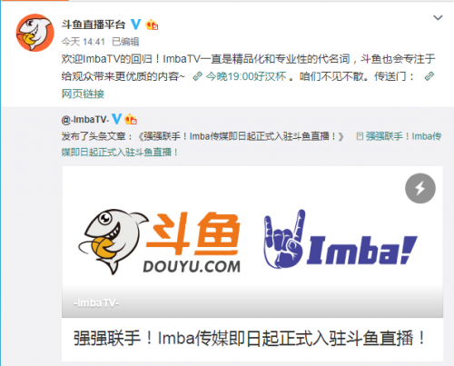 Imba传媒回归斗鱼,赛事呈现迎来新契机