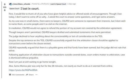 参与《星际公民》众筹的玩家将不能再从开发商Cloud Imperium Games(以下简称CIG)处获得退款。根据《星际公民》这个项目目前的名声来看,这恐怕也不是什么值得惊讶的事。但是,其实这项规定已经存在很久。 早在2016年6月6日,《星际公民》开发商CIG就在服务条款(TOS)中移除了常规的退款操作,但直到2017年12月这项条款才正式生效。从那时起,CIG就开始拒绝玩家的退款要求。一群以Reddit用户“Firefly212”为首的众筹者们决定不能让CIG贯彻这种霸王条款,于是他们今年六月初在美国的小额法庭(small claims court)起诉CIG,开庭日期定于7月13日,并且判决也将在同一天宣布。 根据Firefly212的说法,他们败诉了。法院的判决不认为关于服务条款“欠缺考虑”的指控成立。至于CIG方面,他们派出一个利益代表,表示法院的判决应该立刻生效,包括早期进行的交易也同样适用于新的服务条款。 “这些服务条款(TOS)不影响在生效日期之前进行的任何交易。所有先前的交易均受交易日期生效之时的服务条款的约束”,—CIG代表如是说道。 这个“生效”意味着Firefly212拿不回自己的钱了,法官也驳回了起诉。考虑到目前的《星际公民》服务条款移除了众筹者所有关于退款的权利,Firefly212败地很彻底。这还并没有结束,为了了解这件事对CIG和《星际公民》众筹者的意义,我们找到了一个叫Derek Smart的人。 Smart是一名独立游戏开发者,他近几年一直在关注《星际公民》的古怪举动。他在自己的网站上运营着一个讨论会,记录了从2015年至今《星际公民》服务条款的变化。根据Smart的统计显示,CIG已经在服务条款中移除掉几乎所有众筹者的权利,这包括CIG与众筹者之间的债务关系,CIG在游戏开发之初承诺给玩家的好处,而且根据新的服务条款,CIG也没有义务提供最终的完整游戏。这些变化很多,但我们现在必须回到退款的话题上来。 在推特上,Smart发表了对Firefly212事件的看法: 根据Smart的陈述,失败的先例已经存在,那些还想尝试让CIG退款的玩家们必须进行一场集体诉讼,但这种途径也已经被《星际公民》服务条款所禁止。 最近的众筹者们仍然有可能获得退款,但必须保证在参与众筹的14天内发起请求。CIG之前就没有对退款请求进行回应,而CIG现在也明确表示想要拿回自己的钱,那是不可能的。 |
