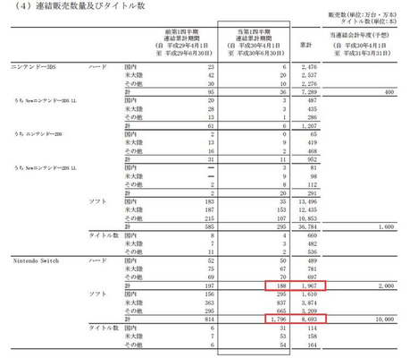 任天堂预计,自2018年4月1日至2019年3月31日的整个财年里Switch的销量将达2000万台,游戏销量则为1亿份。 3DS方面情况: 上市八年以来,3DS的生涯累计销量已经达到7289万台,第一季度的销量为36万台(同比减少61.9%);3DS平台的游戏软件生涯累计销量达3.6784亿份,第一季度销量为295万份(同比减少49.6%)。任天堂还在今年6月重新发售“NES经典版”主机(Nintendo Entertainment System: NES Classic Edition),并且录得了126万台的销量。