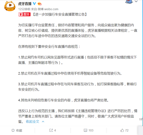 虎牙第一时间宣布禁止网约车直播 倡导打造绿色直播环境