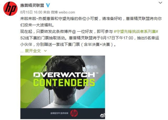 惠普电脑除了赞助赛事制作也常常举办面向《守望先锋》玩家的微博活动,向玩家送出精美周边礼品,吸引更多玩家关注《守望先锋挑战者系列赛》。惠普电脑始终致力于打造专业电竞品牌, 在《守望先锋挑战者系列赛》线下赛的展台中,惠普电脑也向现场观众们送出了诸多福利。