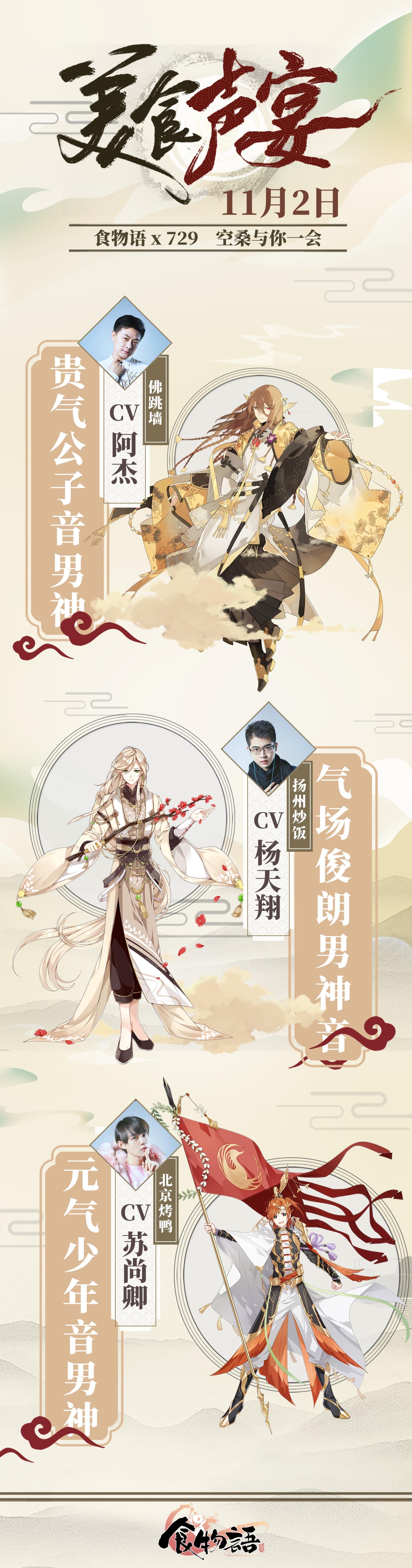 11月2日,国风美食少年养成手游《食物语》将开启一场名为“美食声宴”直播活动,知名CV阿杰、杨天翔、苏尚卿届时会亲临现场,讲述为食魂配音的趣事,与玩家亲切互动。与此同时,《食物语》安卓删档不付费测试也正式开启。 美食化魂:性格各异的食魂小哥哥等你召唤 《食物语》是一款美食拟人的卡牌手游,背景设定在由少主(玩家)管理下的美食国度“空桑”,玩家作为食神伊挚的孩子,从空桑出发踏上旅途,穿梭于各个时空,寻找因承载着食物灵魂的古籍《食物语》被毁而散失四方的食魂们,见证他们作为菜肴诞生于世的时刻。其中性格各异的食魂小哥哥们与玩家有爱互动,是游戏的一大亮点。温柔体贴的佛跳墙、元气满满的北京烤鸭、知书达理的扬州炒饭、威武霸气的德州扒鸡……他们性格迥异,个性十足,每一个都有着鲜明独特的人设。 豪华阵容:知名声优倾情献声 在众多食魂里,佛跳墙、扬州炒饭、北京烤鸭三个角色拥有很高人气。佛跳墙原名满坛香、福寿全,属闽菜系。有人作诗称赞“坛启荤香飘四邻,佛闻弃禅跳墙来”,故有了“佛跳墙”这一称谓。在《食物语》手游里,佛跳墙是一名雍容华贵的贵公子,喜欢一切美的事物,由知名声优阿杰配音。 由知名声优杨天翔担任配音的扬州炒饭,有一头瀑布一般的金色长发,长相俊朗,知书达理,被玩家们称为食魂里的“男神”。而北京烤鸭是一名元气热血的少年,尽管有千年历史、被誉为国菜的殊荣,仍然不失少年的开朗活力。北京烤鸭由知名声优苏尚卿担任配音,活力四射的少年酥音让你少女心持续满电! 美食声宴:声优现场配音直播 11月2日,为回馈喜爱游戏和声优的玩家,《食物语》即将开展“美食声宴,729小馆营业中!”为主题的声优直播活动,佛跳墙、扬州炒饭、北京烤鸭三个食魂的声优阿杰、杨天翔、苏尚卿都将亲临现场,讲述为角色配音的幕后故事,同时还将上演直播吃“自己”的大戏,男神音与美食碰撞出的火花令人期待! 整个直播中会设置多个有趣环节,三位声优老师也会和线上玩家们密切互动,还有各种小彩蛋等你发掘~玩家观看直播并发送弹幕,就可以和你喜欢的声优老师进行互动,更有机会参与弹幕抽奖,得到声优老师们签名的精美游戏周边礼物哟! 本次直播由腾讯云提供独家直播技术支持,腾讯视频、企鹅电竞、斗鱼直播、虎牙直播、熊猫直播、触手直播、全民直播、KK直播、大圣娱乐、战旗直播、狮吼直播、一直播、大神互动、克拉克拉、Bilibili将联合直播,敬请期待! |