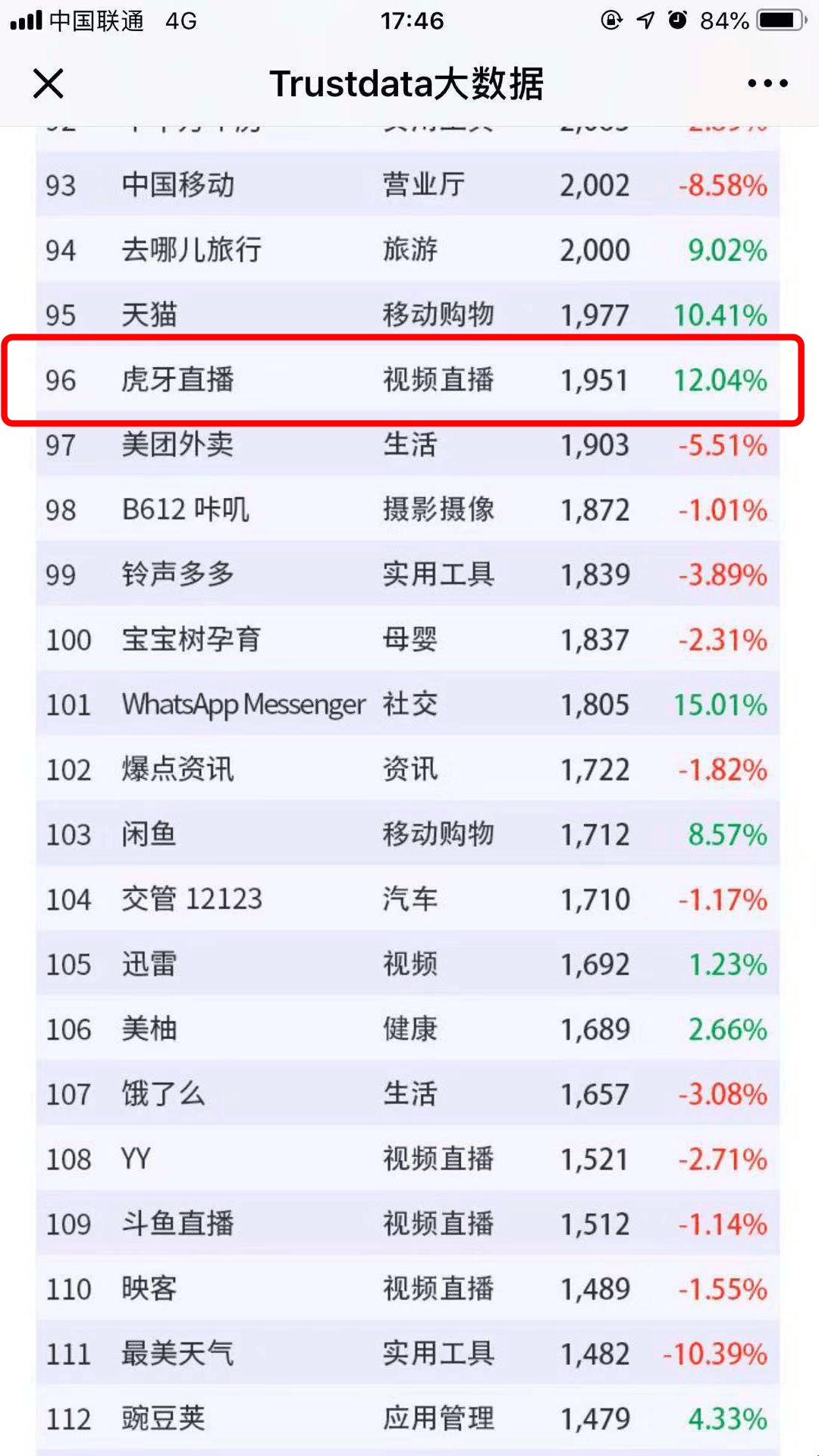 Trustdata10月榜:虎牙直播月环比增长12.04% 成TOP100唯一入围直播平台