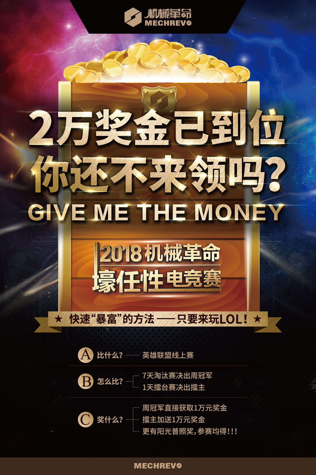 2018机械革命壕任性电竞赛战队大招募! 在近一年里,英雄联盟似乎被绝地求生抢了风头,不论从玩家数量还是话题热度上,绝地求生更多的出现在人们的视野里。但是随着IG捧起英雄联盟S8世界冠军的奖杯带来的热度,英雄联盟出现了大量玩家回流的现象。人气游戏本品牌”机械革命”为庆祝IG夺冠,举办本次电竞比赛,目前正在火热报名中。 2018机械革命#壕任性#电竞比赛是一个以英雄联盟为平台的娱乐性赛事,采用独特新颖的赛制,旨在为更多玩家提供赢取奖金与奖品的机会,每一位浴血奋战玩家在这项赛事中将会得到丰厚的回报! 玩法简述: 5人组成1支战队,每周进行BO1淘汰赛直至周冠军赛采用BO3,每一周周冠军可参加擂台赛,擂台赛采用BO5. 奖励:周冠军可获得1万元现金奖励,擂主另外可获得1万元现金奖励。所有参赛队伍,每场获胜都可以获得积分,人气投票也可以拿到积分,总积分达标可以兑换PS4、Switch、机械革命背包、机械革命鼠标。 比赛时间:12月3日开始,每周一至周日(具体时间视比赛时间而定) 报名时间:11月26日-11月30日12:00(周赛一) 11月30日12:00-12月7日12:00(周赛二) 12月7日12:00-12月14日12:00(周赛三) 周赛四待定 报名方式:关注微信公众号【Mechrevo校园】,发送关键字【报名】即可获得报名链接 这是一场向全社会16周岁以上的玩家开放的比赛 奖金巨大、奖品丰厚 玩游戏已经不仅仅是消磨时间 更是一种能力的体现 来报名参赛吧! 更多比赛相关可查询【Mechrevo校园】 |