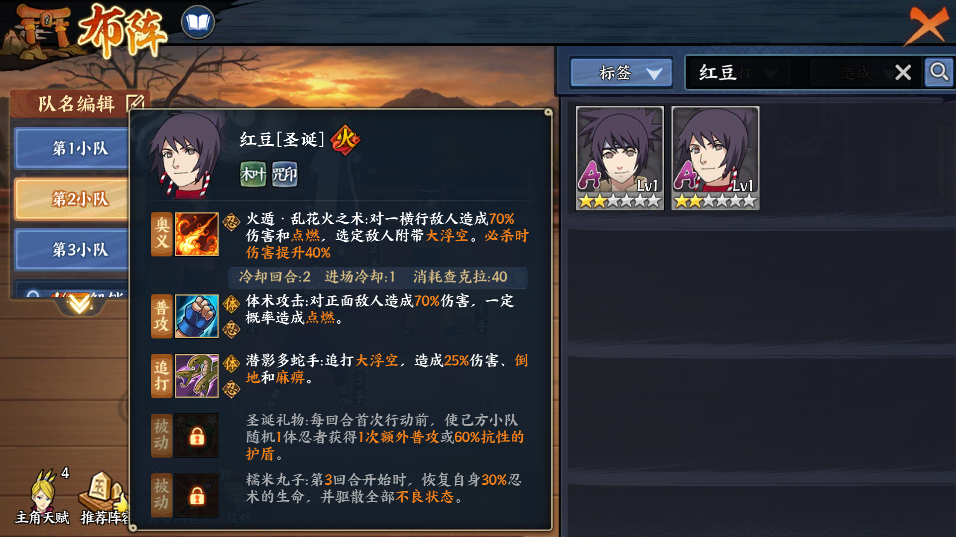 简介:圣诞节专属忍者红豆的获取方法、以及忍者介绍。 随着圣诞节的到来,圣诞节的专属活动也登场了,参加活动会获得圣诞节专属忍者,甚至还有其他丰富奖励。那么如此精彩的活动,怎样参加才能把收益最大化呢? 这是一个圣诞专属活动,在活动期间可以挑战副本,但每天只能挑战两次,这两个副本分别是普通和困难,挑战不同难度的副本,都会掉落不同数量的三色丸子,三色丸子达到一定的数量,就可以领取红豆【圣诞】的碎片,也可以领取封印卷轴等奖励。 普通—普通副本挑战一次只能获得10个三色丸子,如果想要获得一个完整的红豆,那么需要180个三色丸子。因为活动时间只有六天,如果每天全打普通副本,一天也就20个三色丸子,六天下来只能获得120个三色丸子,距离180个三色丸子还差60个。 困难—困难副本挑战一次能获得15个三色丸子,如果两次全打困难副本,一天能获得30个三色丸子,六天下来就是180个三色丸子。这也证明只有打困难副本,才能在有限的时间内获得足够的三色丸子,所以打普通副本是没办法集齐圣诞红豆碎片的。 这个副本还有一个获得收益更高的方法,那就是上阵御洗手红豆【圣诞】会获得额外的三色丸子。 前面说到,“圣诞恋雪”可以获得御洗手红豆【圣诞】碎片,这里还有另外一个途径获得御洗手红豆【圣诞】就是参与累计充值,只要充值到一定的数量就可以直接获得,但这种方法只适合部分玩家,对于平民玩家来说还是老老实实打副本吧,毕竟多几个碎片也升不了星。(这里是指副本给的碎片) 如果小伙伴们已经获得了红豆【圣诞】,那就一定要带上她打副本,收益会非常的高,普通副本可以额外获得15个丸子,而困难副本可以获得25个丸子,所以说一定不要忘记把她带上。 火影忍者动漫原著中特别上忍,大蛇丸门下弟子美女御洗手红豆【圣诞】惊艳登场!在火影忍者动漫原著中,红豆总是给人精神饱满、英姿飒爽的印象,对于叛逃出村的老师大蛇丸同样不讲情面。身着圣诞华服的红豆带来了喜庆节日的视觉体验。看她身着红白相间的圣诞装,似乎要成为圣诞使者为玩家们带来一份大惊喜! 御洗手红豆【圣诞】最全技能介绍: 奥义:火遁·乱花火之术-对一横行敌人造成70%伤害和点燃,选定敌人附带大浮空。必杀时伤害提升40%。 这个奥义和普通的A级忍者红豆伤害一样,唯一不同的是必杀时没有结界了,改为了更高的爆发。 普攻:体术攻击-对正面敌人造成70%伤害,一定概率造成点燃。 普攻和普通红豆还是一样,不过大浮空改成了点燃效果,伤害比以前高了,但没有了起手能力。 追打:潜影多蛇手-追打大浮空,造成25%伤害,倒地和麻痹。 这个追打还是原来的味道,基本上没有改变。 被动:圣诞礼物-每回合首次行动前,使己方小队随机1体忍者获得1次额外普攻或60%抗性的护盾。 这个是一个增益性被动,虽然没有了结界,但这个效果更强了,关键时候能救人,也能让友军额外普攻一次。 被动:糯米丸子-第3回合开始时,恢复自身30%忍术的生命,并驱散全部不良状态。 这是一个很强的被动,类似于丁次[少年篇]的那种,可以解除控制效果,也能提高生存能力。 红豆【圣诞】和普通A忍红豆一样,都是多功能型忍者,但这两个的作用不一样,很显然普通的红豆偏向于辅助一些,主要以保护别人为主,而红豆【圣诞】偏向于爆发一些,需要被保护,所以搭配时尽量放在后排,毕竟一个功能型忍者抗不了太多的伤害。红豆【圣诞】适合二三号的站位,既不会影响一号位的输出,又不会因为在四号位装备的差距打不出伤害。实战中可以配合高奥义伤害与回复查克拉的忍者,在第二回合释放两个奥义对敌方造成大量伤害,后期依靠自身被动叠盾增强队伍生存能力。可搭配的阵容有疾风之舞+君麻吕+夕日红+红豆【圣诞】,此阵容在前期依靠风主被动多重影身之术与红豆【圣诞】被动圣诞礼物提高队伍生存能力,在前期不易损失太多血量,后期靠君麻吕与红豆【圣诞】奥义打出大量伤害。夕日红的加入可以让队友避免被先手控制,提高队伍生存能力。 总的来说,红豆【圣诞】还是蛮强的,主要是可以免费获得,这对平民小伙伴们非常友好,所以为了大美女红豆【圣诞】,千万不要忘记参加这个活动哦! |