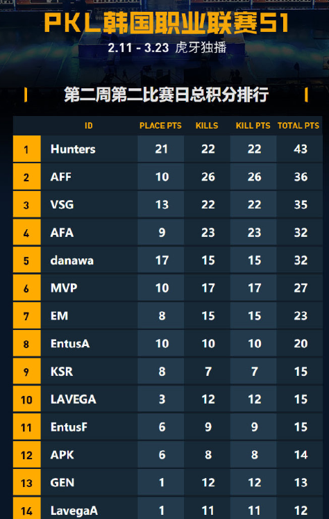 绝地求生韩国赛区作为赛事体系中公认实力顶尖的联赛,自2月11日以来便带给玩家们无限的乐趣,而在2月20日,虎牙独播PKL韩国PUBG甲级联赛S1第二周第二个比赛日A&B组赛事开打,当PGI冠军战队遇上PAI冠军战队,火力全开的PKL联赛将会有哪些精彩呢? PKL韩国职业联赛S1于2月11日-3月23日进行,每周一、三下午六点,星期六下午一点,虎牙带来全程独家直播,当观众们还在回味Ranger战队1V4的场景时,新一周的PKL已经打响。 A&B组对战中尤为激烈,JOY和阿梅盛赞韩国战队击杀高且运营强,当 danawa、EntusA和MVP战队盘踞山头决战时,danwa成员yacha手雷失误炸死队友 ,最终MVP战队以11杀成功吃鸡拿下开门红。 值得一提的是,在PKL赛场上还出现了低打高的奇迹。首局Hunters战队的Pio作为独狼苦苦挣扎,利用山头底部地形横向移动影响敌人预瞄点,成功收割AFF战队2名猛将人头! 身为冠军战队的VSG战队果然保持极佳的状态,恐怖击杀13杀吃鸡,同时三人进入决赛圈对战APK独狼,混烟中灵性走位击倒black 9拿下胜利! 第三局比赛中,AFF战队占据梅花桩中心点,决赛圈最后时刻danawa先手击杀AFF战队一人,再莽向前混烟中一波猛扫,7杀拿下第三局,通过一系列的细节操作中不难看出,能够获得此局胜利实属不易,不难看出这支战队的顶尖实力。 据了解,Hunters战队状态恢复,保持运营满编进入决赛圈,占据山坡有利地形逐一消灭敌方,八杀吃鸡摆脱排名倒数的颓势,可以看出每支战队的实力都不容小觑。 第二周第二个比赛日A&B组的四场对决已经结束, Hunters战队以46积分登顶第一,AFF战队和VSG战队分别排列第二三名,AFA和danawa等战队仍有赶超的可能。 PKL经历五场比赛后,总积分出炉!PAI冠军VSG战队与PGI冠军AFF战队仅仅相差一分!到底谁能最终登顶呢?2月23日PKL第二周A&C组对决来袭!敬请锁定虎牙直播! 与此同时,更有PUBG精彩联赛将在23日9点直播!NPL超级杯(甲乙对抗赛)即将开打,到底谁将会升级而谁将会降级?锁定虎牙直播,蓝光高清不卡顿观赛! |