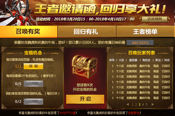 2019乙亥年2月21日,运营了15余年的《征服OL》重磅推出了全新的资料片——斗战苍穹!此次更新的资料片内容中,最为耀眼的当属新职业:斗神。接下来,玩家们将全面了解到新职业斗神的内容以及尾兽收集玩法和双人骑宠功能。 在新版本中,最耀眼的更新内容就是新职业——斗神! 斗神秘史—— 相传征服大陆的北疆,是一片白雪皑皑的冰原,而在冰原的尽头处,则是浩瀚的无尽之海。这里气候严寒,自古被中原人士视为死亡之地!可不为人知的是,在冰原的深处,竟然存在着一个偌大的北地部落。 北地人以凿冰捕鱼和猎杀北地雪兽为生,极端的环境和无数次生死搏杀将他们历练成了骁勇善战的猛士。为了保护自己的部落,北地人打小就要接受高强度的修炼。这样一来,他们便创造出了一套独特的功法,名为斗术!这,便是斗神的由来。 斗神职业定位—— 斗神的职业定位是:高爆发、高法强、高输出。XP时,斗神可以无视敌方免疫并抵挡来自对方的致命伤害,轰杀四方,打团无敌! 而斗神升职的途径则是:斗士、斗师、斗尊、斗圣。 斗神专属武器—— 由于斗神掌控着雷霆之力,右手的神锤开天,左手的战斧劈地!因此专属武器属单手短武器类型,锤只能装备到主武器位,战斧只能装备到副武器位,注意:装备战斧时必须同时装备锤。而专属武器可以通过以下6个途径获取: 1、新建斗神角色,默认自动获取; 2、斗神职业的就职礼包; 3、金币武器商店购买; 4、通过打怪概率掉落; 5、桃源灵玉抽奖获得; 天石商店、赠品天石商店购买。 斗神技能—— 斗神共有6大攻防兼备的技能,以及1个XP技能,技能触发都需要装备战锤和战斧。 雷霆万钧:可攻击一条直线上12格范围内的所有目标,击中目标后降下2道落雷,并造成伤害。 锤震山河:将巨大的雷神之锤砸向地面,形成一个半径为10格的伤害圈,对圈内所有目标造成伤害,同时会消耗15点体力值。 皓然斗势:对单个目标发起攻击,并造成伤害。每次攻击累积20点能量,根据累积能量提高对目标的伤害。能量累积到100时将触发更强大的技能——“战天斗地”。 雷神天威:进入“雷神”状态,可在空中飞行40秒并无视任何伤害,每隔1秒可对全屏目标进行攻击,冷却时间90秒。 紫电神盾:使用后形成一个包围自身的护盾,普通状态下可吸收20000点伤害,XP状态下可吸收21000点伤害。每隔8秒回复20点体力值。护盾效果持续10秒。 电闪雷鸣:可攻击一条直线上10格范围内的所有目标,并造成伤害。 雷破八荒(XP技能):移动速度提升50%。点击右键释放出一个以自身为中心,半径10格的伤害圈,每隔2秒对圈内目标进行持续5秒的攻击,并造成伤害。 尾兽收集玩法 关于尾兽 一只可以跟随人物的小宠物,可以提升玩家属性及增加特性效果。 尾兽的获得途径 玩家第一次装备满5件神纹时,即可激活尾兽功能,并直接获得第一只尾兽。 尾兽的养成 尾兽通过食用材料进行升级,初始1阶0星,每10星提升1阶,每次升星都将给尾兽增加一些属性。 尾兽的外形 尾兽会随着等级及星级的提升,发生变化,每次升阶,有几率触发尾兽变异,获得新的外观。 双人骑宠功能 在《征服OL》的世界中,个性的坐骑都是不拘一格的罕见神兽!自由驰骋于江湖,体验风一般的极速快感!上百种外形,随机出现的极品宝马,亲手打造的罕见灵驹,此次双人骑宠又将带给我们怎样的惊喜,让我们拭目以待! 新资料片11大主题活动 为了配合新版本的上线,官方此次为玩家们送出11大福利活动!!!其中就有为斗神职业量身定制的“斗神特权月”! 斗神特权月 1、斗神职业玩家首次登录游戏后即可获得1个【斗神特权】礼包,时效为30天,每天可以开启一次;2、每周一职业PK赛,斗神组冠军增加奖励(角色增加5%经验值、赠品修为值礼包(3000点修为值)、赠品气力值礼包(3000点气力值);3、组队PK赛、组队大众PK赛的冠军队伍内有斗神职业,队长领取礼包时将额外获得奖励(1亿征服币礼包、5个龙珠礼包(激情服此类奖励为:5个+5赤炼石)、5个1%神佑7天武器外套礼包);4、同步促销斗神职业套装。 新职业冲榜活动 1、公测当日玩家体验新职业,达到相应等级可获得相应奖励 2、对全服选择新职业的玩家,根据武器追加进度排名,排行榜前10可获得对应奖励 3、所有玩家根据帐号鉴定方式进行排名,全服和各服第一可获得相应礼包奖励。 奖励有:新职业极品装备、稀有黄色神纹可选包(赠)、优质神纹源晶(赠)等。 助力资料片,全民瓜分十亿天石! 玩家登陆页面点赞积累天石,2月21日公测当天上线瓜分积累天石数量,最多可瓜分十亿赠品天石。 庆资料片公测,微信转发锦鲤 关注《征服》官方公众订阅号,在公众号回复锦鲤,即可获取转发锦鲤活动图片,转发朋友圈并截图公众号,即参与成功。锦鲤玩家可获得:筋斗云、骑宠外套奖励。 神纹促销活动 1、开启神纹购买活动,参与该神纹购买消费达指定金额可获得返利奖励。最高返利为稀有黄色神纹随机包(赠)、优质神纹源晶(赠)及5W气力值奖励 2、购买神纹同时还有免单机会,返相应消费金额赠品天石 3、神纹抽奖寻宝,有机会获得神纹随机包奖励。十连充还可获得惊喜连连礼包 王者邀请函,回归享大礼 活动时间:2月21日15:00-3月21日23:59 召唤玩家登录页面,可以生成专属邀请码,回归玩家填写后可与召唤玩家形成绑定关系。之后召唤玩家完成一定条件后,可获得开启宝箱的机会,进行抽奖。同时召回玩家数如果