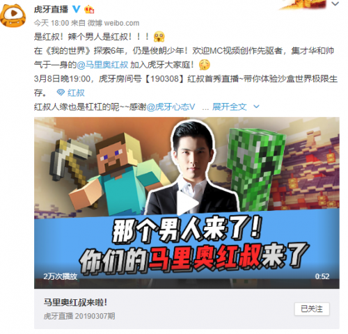 最近虎牙直播真是频频传出大神主播加入的消息,除了以往LOL、王者荣耀、绝地求生这样的虎牙热门版块,在《我的世界》频道也迎来了一尊大神——马里奥红叔! 资深一点的MC们对马里奥红叔这个名字应该都不陌生,从2013年的时候红叔在优酷上传《我的世界》实况视频开始,到现在已经坚持了6年,发布了超过4000条视频! 马里奥红叔轻松、幽默甚至有些贱兮兮中二的视频风格俘获了一大批粉丝,去年还获得了优酷粉丝奖。《我的世界》是一款极为开放和讲究创造力的游戏,红叔也发挥了自己各种幽默和想象力的天赋,他制作的“生存大逃杀系列”和“红小队の奇妙冒险系列”都是粉丝最为津津乐道甚至是入坑之作。可以说,红叔是很多MC玩家的启蒙老师了。 虎牙直播对于赢来先驱级大神主播也是做足了宣传,3月5号就在官微发布了悬疑海报,当时就有不少粉丝猜测或许是红叔。 3月7日,虎牙直播正式公布了马里奥红叔入驻虎牙,粉丝们也纷纷送上祝福。毕竟从今年31日后,红叔和前直播平台合作终止,后续签约去向一直没公布,现在入驻发展更好的虎牙直播对于红叔本人和粉丝都是最开心的事。 这次马里奥红叔入驻虎牙直播,今天19:00开启首秀,心态、难言、婷小姐、上好佳、小潮、童子一众虎牙大神主播也纷纷发起应援表示欢迎和祝福。有这么杠杠的人缘,想必红叔今后在虎牙直播也能更上一步台阶。 |