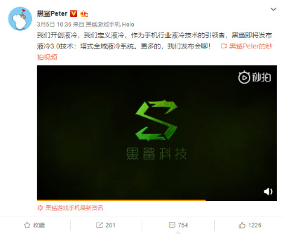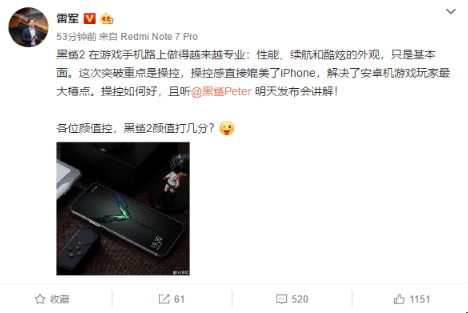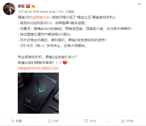 雷军连发5条微博揭秘黑鲨新品“大招”:触控媲美iPhone