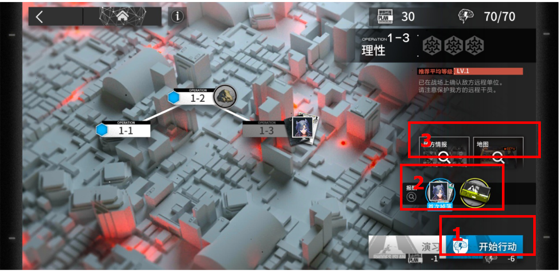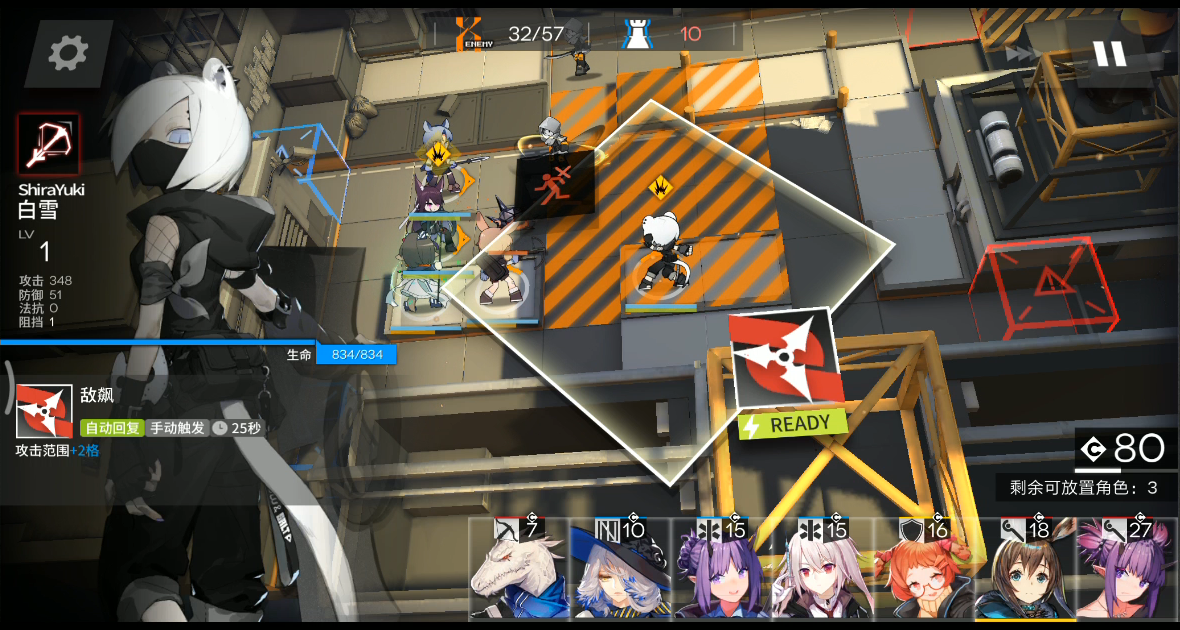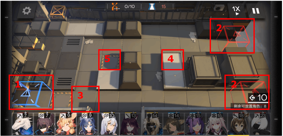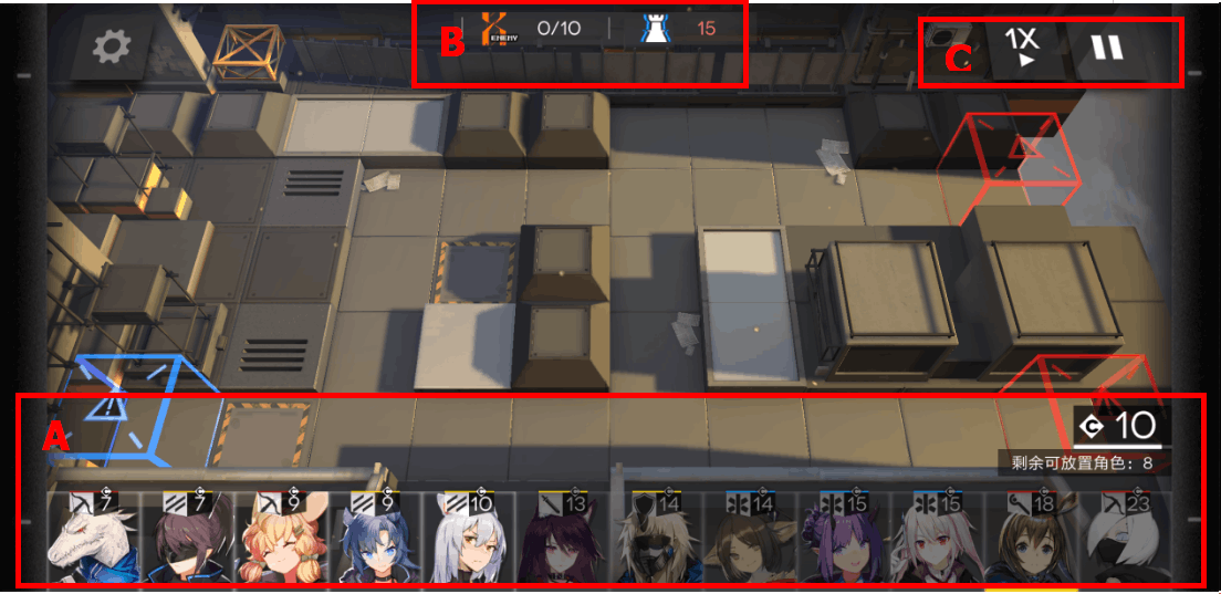 明日方舟作为当前市场上比较少见的塔防式手游,很重要的一块就是其战斗系统。毫无疑问,明日方舟的玩家中,有之前玩过塔防式手游或者页游的玩家,也有只听说过大概的玩家,更会有完全没接触过这种游戏的玩家,因此今天就为大家简单讲解一下明日方舟的战斗系统。 关卡选择 在关卡选择界面,我们可以知道关卡的某些初步信息。 1:关卡所消耗的理智,换句话说就是体力。如图,关卡1-3所消耗的理智是6点。不使用支援三星通关后这里还会出现代理指挥的选项,我们下面会讲到; 2:本关掉落的报酬,一般包括龙门币、经验卡、各类物资等,还有一些只有首次通关才会掉落的部分,比如本图中的芬; 3:敌方情报和地图情报。这是很重要的部分,强烈建议在进入新关卡前仔细研究地图,以准备队伍里合适的干员比例; 二、战斗地图 为了不使图上的标识过于繁杂,我们分几个部分来讲解游戏地图。 首先是地图本身。 1:我方大本营,一般关卡的全部目标就是尽全力阻止敌人进入这个方块,当有一定数量的敌人成功抵达这里时,关卡就宣告失败。注意在有些关卡里,我方大本营可能不止一个,敌人进入任何一个大本营都会计数; 2:敌方大本营,敌人出发的敌方。如图所示,很多时候都有不止一个敌方基地,要分配好干员资源; 3:近战干员格,可以将我方的近战干员部署在这些方格里。由于地图场景的不同,方格的样子可能会略有区别,但整体上大同小异; 4:远程干员格,可以将我方的远程干员部署在这些方格里; 5:特殊格,这些格子不能部署近战干员,同样也会因为地图场景不同而不一样,但一般都能一眼分辨; 其次是我们的操作界面。 A:这是我们最需要关注的部分。我们编队里的所有未放置干员都在这里,同时小头像上会显示干员们的基本信息,包括种类、cost以及再部署时间。区域角会告诉我们可用的总cost和剩余可放置角色数量。 总cost一般而言会随着时间增加,根据关卡不同,有些时候不会随着时间增加,而是每击杀一个敌人获得一定数量的cost,或者随着时间增加的速度会不一样。另外,有些干员的技能也可以增加总cost,比如芬。 至于剩余可放置角色,一般而言,我们并不能将我们编队里的所有干员都部署下去,而是需要带上应对不同情况的干员,以应对各种各样的情况。有些时候还会因为敌方火力猛烈而多带几个同类型的干员来轮换。但需要注意的是,我们的一星机器人们并不受这个限制,有些干员技能的召唤物也一样,因此某些时候能发挥出额外的战斗力。 B:这里分为两个部分,左边的部分是目前已经击杀的敌人数/整个关卡的敌人总数,可以看到在图中,关卡刚开始的时候是0/10,表示本关一共有10个敌人会陆续出现,现在还一个都没有击杀。 右边的部分则是我们大本营一共能承受的进入敌人数目,通俗地说就是血条,本关一共可以承受15个敌人——这实际上已经超过了敌人总数,毕竟是剧情开头,相当于是教学关卡,十分简单。 C:这里我们可以暂停或者调节关卡整体的速度,目前可以在一倍速和二倍速间切换。 三、战斗操作 在战斗地图里,我们能做的操作包括以下几种:部署干员,发动技能,撤回干员。 部署干员 部署干员的操作很简单,分为两步。第一步是将可以部署的干员(这里我们选择芬)从干员列表中拖到想要部署的格子上。如图所示,可以部署的格子会在地图上以绿色显示,十分人性化。而黄色的斜条纹区域则代表了该干员的攻击范围,芬可以攻击她自己和身前一格,一共两格的敌人。 第二步是选择方向。将干员放到合适的格子上后会出现如图所示的菱形方框,这时候再把干员拖向想要面对的方向即可,一共有上下左右四个方向可以选择,如图我们选择了右边。 发动技能和撤离干员 干员们都有多种多样的技能。部署了干员之后,只要干员的能量蓄满就能发动。 如图,白雪的敌飒技能已经准备完毕,点击右方的大图标就能发动。左边会显示干员详情和技能信息。自动回复指的是随时间回复能量,手动触发则是需要玩家来开启技能,最后的时间是技能的持续时间——当然,技能远远不止这一种,还有包括随攻击次数增长能量型技能、变身型技能、被动技能等多种类型。 干员小人左上方的按钮是撤离按钮,可以将干员立即撤离战场。主动撤离的干员会返还一部分cost,同时在干员槽度过一段时间后,就可以再次满状态返回战场,代价是部署cost会比第一次升高。每重新部署一次都会提高cost要求。 四、战斗技巧 明日方舟的战斗系统并不复杂,实际上相当简明。但其中有很多细节都可以在同等编队条件下提高战斗力,这一部分会为大家总结几条。 ·只要不是特殊情况,开局请尽快部署先锋干员。 先锋干员是一类特殊的干员,一般有以下几个共同点:cost低,战斗力不太强但均衡,拥有能加速cost运转的技能。这几个特点决定了这类干员越早部署越好,同时他们一般也足够应付最初的几波攻势——也许这就是为什么他们名叫先锋的原因。 ·及时止损 如果干员在战斗中倒下,会和主动撤离一样进入CD。而主动撤离的好处在于可以返还一部分该干员的部署cost,因此如果在战斗中有余力,最好在干员即将倒下的时候主动撤离,这样能减小一点cost的压力。 ·搭配合理 一般情况下,一支队伍最基础的干员组成应当包括: 2到4名用来阻挡敌人的近战干员,包括先锋,近卫和重装。其中先锋必带,因为那是前期