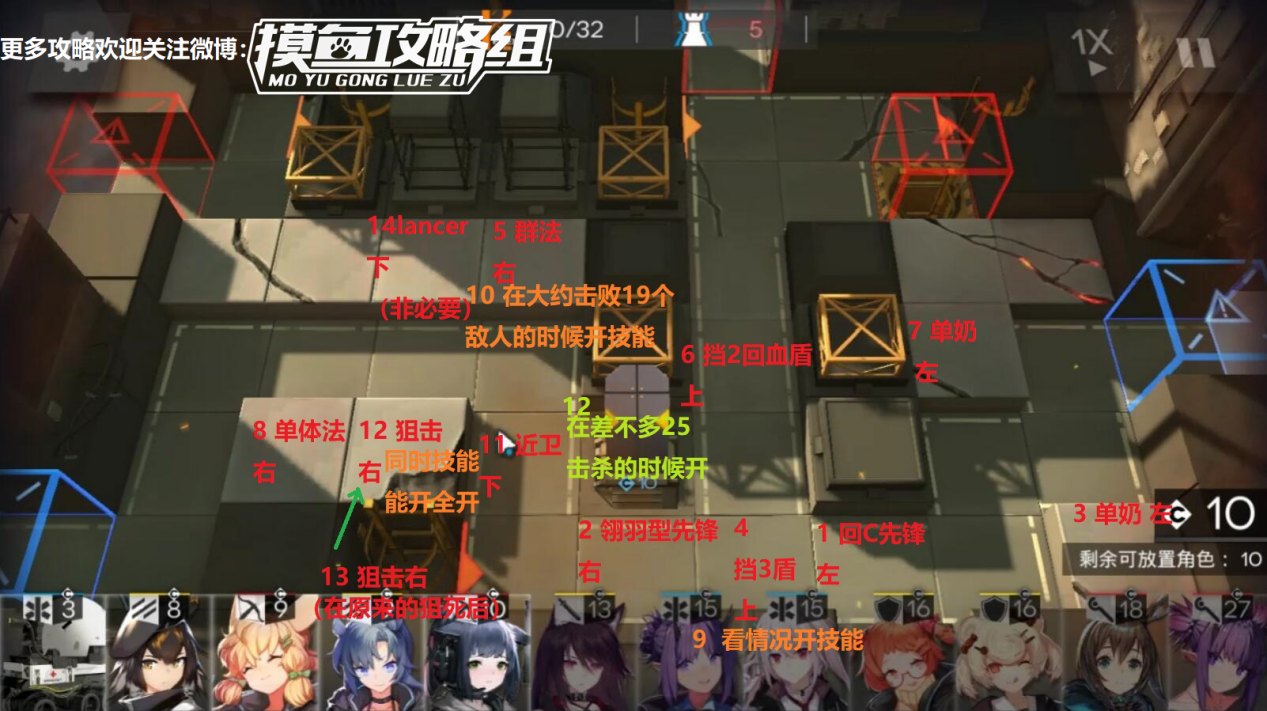 视频攻略: 建议跟着视频打 推荐配置: 实际上可以比图中配置更低。 先锋*2:拥有恢复cost技能的先锋、拥有击杀回复COST撤离返还COST的。30级左右 狙击*2:对空特性的高攻速狙。25级左右 近卫*1:物理单体。25级左右 医疗*2~3:2个单体奶,1个Lancet-2(非必要)。20级左右 术士*2:单体术士、群体术士。20级左右 重装*2:挡3盾、挡2回血盾。25级左右 一图流关卡攻略: 【注释解释】 例: 3 对空狙 上 最前面的数字是操作顺序。 范例中的意思是:第三步。 后面跟的是放什么角色,或具体操作。 范例中的意思是:我们这里要放对空狙。 最后的方向是角色摆放的方向。 范例中的意思是:这个角色攻击方向朝上。 也就是:在第三步放下对空狙,并且攻击方向朝上。 绿色线条:没地方放字了,所以把这个格子标注出来在其他地方打字。 击杀数:屏幕上方的例如 25/75,前面的25就是当前击杀数。 注意点: 2实际上这个位置能补其他近战位输出也行,但是cost最好低以防别的角色没cost放 6这个位置是带回血技能的盾 9感觉盾遇到敌人比较多了就开技能 10感觉 6这个位置的敌人多了就开技能,大约在屏幕上方的击杀数达到19的时候可以开了 12 这一个阶段操作比较多,如下: ①这个狙击放下后,差不多BOSS要出来了 ②BOSS出来后能开的技能全开,并且要开始操作装置了 ③屏幕中间的装置:在开的时候需要包含到BOSS,时机很难用文字描述,差不多是击杀数达到25时。此时的状态是:BOSS出来了,轰炸了12号位,然后6号位遇到了新的一波敌人 13 在12的狙击死后立刻补个狙击,没死的话就不需要补了 14 这一步不是必要的,只是为了以防万一 |