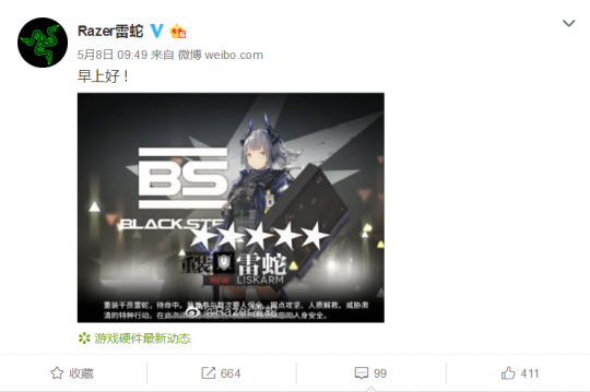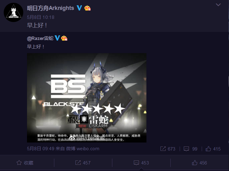 中国消防和明日方舟在微博上的互动还没过去多久,又一个似乎八竿子打不着的官方也和《明日方舟》这个近期热度高的吓人的游戏来了一个亲密接触。 这次来的是著名的美国外设厂商——雷蛇。 但凡是有过些年头的游戏玩家,没有一个会不知道这家外设厂的鼎鼎大名。 雷蛇外设富有科技感的外形、轻便舒适的手感、以及设备本身优良的性能,无一不让玩家为之倾心。 而在5月8日早晨,雷蛇官方照常向粉丝们道早安的时候,配图却和以往不太一样。 虽然依然是“雷蛇”,但这次的配图怎么看都不像是一个鼠标或者其他的电脑外设。而是一个手持巨大盾牌的美少女形象,难道雷蛇这个浓眉大眼的实体产业龙头之一也要搞起“娘化”来了吗? 不过经了解,这次雷蛇官方发博配图中的角色和中国消防转发的“阿消”一样,图片里的这个“雷蛇”也是游戏《明日方舟》中众多干员之一。看到这里小编不免感到有点庆幸,毕竟图上的这个少女角色也确实相当可爱,如果真的是雷蛇官方的娘化形象,小编刚到手的工资可能又要“信仰充值”了。 面对雷蛇官方的无厘头“搞事”,《明日方舟》的官方也是见招拆招,当起了复读机。游戏制作者碰上游戏设备生产商的这般交流方式,也实在是让人忍俊不禁。 不知各位观众姥爷有何看法呢?写在评论区互相交流吧 |