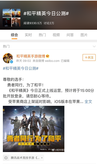 5月8日,《和平精英》开启全平台公测。在开服后的24小时内,《和平精英》登顶IOS游戏免费榜和畅销榜双榜榜首,并获得App Store在Today页面和游戏页面的双主打推荐位。《和平精英》是由腾讯光子工作室群自研打造的军事竞赛体验手游,为向守卫国家领空的蓝天勇士致敬,特邀请空军招飞局协助指导。 游戏免费榜第1 游戏畅销榜第1 游戏页面主推荐位 Today页面主推荐位 从公测启动后,《和平精英》在全平台便引起广泛的关注与热议,在各类社交媒体上表现抢眼,获得大众与玩家的认可。其中,#和平精英今日公测##大吉大利和平精英#等关键词多次登上微博热搜榜,相关话题阅读量已破亿;百度指数与微信指数急速拉升,相关资讯环比巨幅上升,均达到近期峰值。 腾讯光子自研匠心出品 赢取玩家关注与认可 腾讯光子工作室群超300人的制作团队发挥在射击、战术竞技等游戏品类中积累的技术经验与领先优势,为玩家构建一个超拟真的游戏世界,让玩家可在游戏中全方面自由施展战术。光子工作室群的匠心出品,也因此《和平精英》获得社会的广泛关注与玩家的高度认可。 《和平精英》的上线在全网掀起了讨论的热潮, 5月7日-8日, #和平精英今日公测##大吉大利和平精英#等相关关键词12次登上微博热搜榜,总阅读量破亿,同时登顶知乎热榜第一,游戏社区TapTap热门榜榜首,市场热度高涨。多方媒体也针对《和平精英》多维度产出相关游戏资讯,助推游戏公测消息全面传播。 百度指数 微信指数 微博热门话题 知乎热搜 TapTap排行榜 游戏精良制作 全方位赋予玩家极致体验 《和平精英》搭载虚幻引擎4研发,呈现出次世代完美画质,多张超大实景地图,将玩家引入拟真军事竞赛体验。同时赛场中多种武器、丰富载具、空投补给、赛事装备等,均做到高程度拟真还原。真实弹道模拟,真实投掷品投掷轨迹,给玩家完美的体验。 在玩法上,《和平精英》开启百人同场竞技,提供了经典模式、娱乐模式和创意工坊等多种不同体验模式,在游戏中,更讲究策略性玩法。 不管是画质的细节渲染,游戏的拟真体验,还是玩法的策略性设计,《和平精英》都做到精益求精,全方位打造出高品质的游戏体验,让玩家在游戏世界中获得极致的体验感。 “16+”试运行 承担保护未成年人成长责任 腾讯持续探索和尝试未成年人保护的创新路径,此前预告的“16+”试点也在《和平精英》上启动试运行。根据腾讯健康系统的公安实名校验结果,年满16周岁的用户才可以获得授权,登录《和平精英》体验。同时,16周岁及以上的未成年用户,在游戏中仍将受到健康系统的管理,每天限玩2小时。 腾讯开启一系列未成年人保护工作,腾讯高级副总裁马晓轶在发布公开信中表示:承担更多社会责任是行业成熟与进步的标志,希望能为行业探索更有效的未成年人保护方案,这是腾讯在这个时代下应有的责任与担当。 游戏的本质是科技不断进化所带来的生活与娱乐方式的改变。它结合了最新的互联网、通讯、计算科学、图像视觉、人工智能、人人与人机交互等技术,代表了最前沿科技的结晶。腾讯希望通过游戏的形式,向未成年人们体现科学技术的点滴进步,更希望用更多更好的方式,帮助孩子们真正理解与掌握好生活、学习与娱乐之间的平衡,健康快乐的成长。 勇者同行,为了和平,《和平精英》在IOS、安卓等应用市场已正式上架,玩家可唤上队友,来一场属于精英的模拟军事竞赛体验! 更多关于《和平精英》的产品信息,请访问: 官方网站 官方公众号 官方微博 扫码下载游戏 关于《和平精英》 《和平精英》是由腾讯光子工作室群自研打造的军事竞赛体验手游,为向守卫国家领空的蓝天勇士致敬,特邀请空军招飞局协助指导。虚幻引擎4研发,次世代完美画质,极致视听感受;超大实景地图,打造指尖战场,全方面自由施展战术;百人同场竞技,真实弹道,完美的射击手感;好友一键组队,语音开黑;腾讯光子工作室群超过300人团队研发,给您带来一场震撼的竞技体验。 |