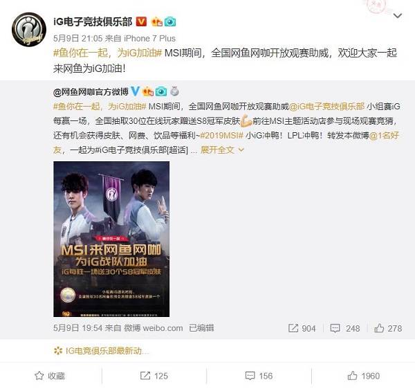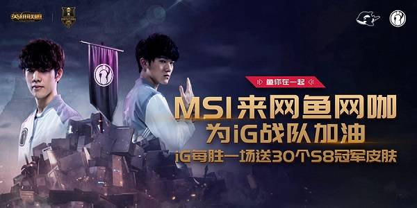 iG官博号召粉丝到网鱼网咖观赛,每赢一场都送冠军皮肤