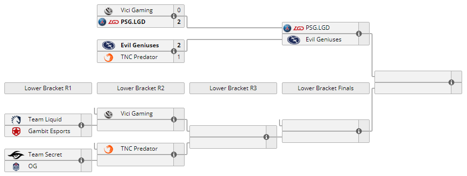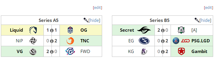 ESL ONE伯明翰站第三日进行了小组赛最后一轮的争夺和淘汰赛胜者组第一轮的较量。在率先进行的A组比赛中,已经锁定小组头名的VG干净利落地拿下FWD,而TNC击败NiP拿到另一个名额。Liquid和OG最后握手言和,然后携手前往败者组。而在B组的最后一轮,三场比赛里两场是生死战,Secret总计用时130分钟击败Alliance,但是不巧的是PSG.LGD仅用时不到30分钟就赢下了和EG的第一局比赛确保了小组第二。KG则被Gambit送回了家,红星老师也凭借这个2:0下克上晋级败者组。