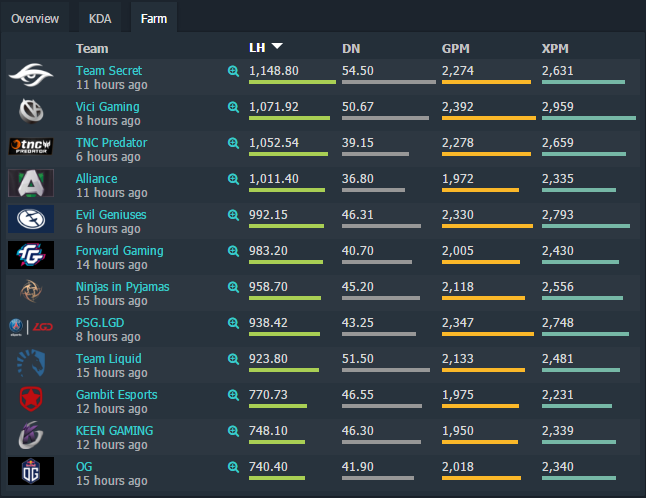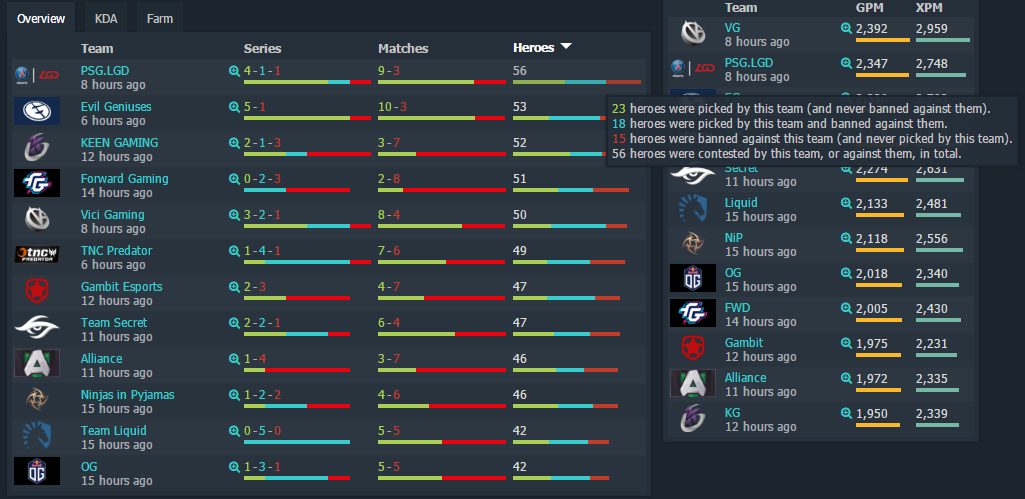 而在之后的胜者组比赛中,PSG.LGD面对VG先声夺人,以一个2:0横扫VG进入胜者组决赛;EG则经过苦战以2:1逆转TNC拿到另一个胜者组决赛名额。今天下午将进行败者组第一轮和第二轮的较量。 在队伍数据方面,PSG.LGD的英雄使用数量(前两项之和)与VG并列第一,远远高过除EG以外的其他队伍,练兵目的明显。结合R神在开赛之前说的“让他们想玩什么玩什么”,不难看出这两支队伍在利用本次比赛与强队交手的机会试验英雄和打法,感受新版本的比赛状态。 而在经济方面,PSG.LGD的补刀却显得异常的少——他们场均补刀数与第一名Secret之间差了足足210刀,但是GPM却反超了一点,这是不是意味着当前版本又是个打架为主的版本? 在比赛时间上,本次比赛的平均时长大致落在35分钟附近。如果除去Secret那一场85分钟的比赛、VG vs FWD那一场60分钟的比赛和EG vs TNC那一场55分钟的比赛,结果会更接近35分钟,这与版本更新之初不少人的判断相符。从图标中可看出,30-35分钟(二代盾后时间)和40-45分钟(三代盾后时间)成为了比赛时长最多的区间,这也符合之前的判断。 在MVP投票方面,第二天结束之后,以下是奔驰MVP粉丝投票目前的排行榜: Ame目前排在第一位,Sumail本来是排在五名之后的,结果发了一条推特就蹿升到第二位了! 中国的刀友们加把劲,别被跳跳超了啊!大家每天都可以到ESL ONE赛事直播间投票哦。 明日比赛前瞻: Liquid将面对Gambit,在小组赛中虽然前者的状态一般,但实力还是高出后者一筹的,不出意外会是一个2:0或者让一追二的2:1;Secret和OG的欧洲区内战较为引人注目,OG的顽强可能会成为决定比赛的X因素,所以双方实际的胜率势均力敌;而在第三场,VG将面对Liquid和Gambit的胜者,如果是前者那么双方必定会陷入一番苦战,如果是后者VG大概率轻松取胜。 |