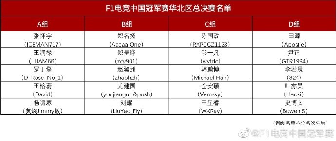 2019年11月16日至17日,世界一级方程式(F1)电竞中国冠军赛华北区分站赛于北京中国教育电视台制作中心演播大厅展开激烈争夺。最终,20强选手成功晋级明年1月4日至5日的全国总决赛。选手尹正成为首个华北区分站冠军,张怀宇屈居亚军,知名F1解说员刘耀晋级20强。赛事IP独家授权和运营管理方及承办方为上海久事智慧体育有限公司,交通银行上海市分行作为首席战略合作伙伴,虎牙直播进行了全程独家网络直播。 比赛日首日,80名选手分为4组,进行残酷的淘汰选拔,每组前四名及除他们外的排位赛顺位最高选手晋级成为华北区分站赛20强。 A组中预选赛成绩排名第一的黄衫车手“卡车司机”张怀宇不负众望,从排位赛开始就一路领先,没有留给追逐的后车任何机会,顺利完成pole-to-win。第二、第三顺位发车的罗于擎和王润禄,从起步发车到最后冲线,一直上演着激烈缠斗,两人排名反复交替,最终分列第三、第二,携手晋级。 B组中排位赛阶段,郑名扬和00后选手郑呈晔稳居前二。备受期待的知名F1解说员刘耀在最后时刻被“老司机”赵瀚洲超越,正赛只能以第四顺位起步。 正赛首圈,凭借漂亮发车,刘耀上到第三,与郑名扬、郑呈晔紧紧咬在一起。第3圈,刘耀率先进站,成功利用undercut超越前车,在前车完成进站后来到了头名的位置。但在长距离圈速上更胜一筹的郑名扬和郑呈晔很快又在赛道上完成了对刘耀的反超,最终以第一、二顺位完赛。比赛末段,刘耀过早的进站导致轮胎性能衰竭,掉到了第六的位置,但他凭借除top 4选手外最快单圈成绩,依然有惊无险地从小组晋级。 C组正赛杆位发车的陈国政,排位赛甩开后车1秒以上,在C组的优势十分明显,最终顺利上演了华北赛区分站赛的第三个pole-to-win。仝安硕第三位发车,但首圈的失误使他的排名瞬间掉到第13位。随后,凭借稳定的长距离表现,他一路奋起直追并最终以第4的成绩完赛,成功晋级。 D组外号“欧皇”的尹正凭借排位赛的出色表现杆位发车,史博文、李若晨分列第二、第三。排位赛意外退赛的田源凭借圈速优势,连续超越前车,发车后仅用了2圈时间就来到头名的位置,并自此保持良好节奏拿下小组第一,上演“王者归来”。最终,尹正、李若晨、叶亦昊三人表现稳定,依次位列田源之后。史博文虽然上墙退赛,但依旧凭借最快圈速成功晋级。 正赛排名小组第二的王理厦,因为排位赛结束后,在未经裁判允许的情况下,擅自启动比赛,根据选手手册相关条例,被裁判委员会取消小组赛的比赛资格。 至此,A组张怀宇、B组郑名扬、C组陈国政实现三连“pole to win”,D组田源队尾发车,一路追击,在第2圈成功上到领先位置,随后跑出了自己的节奏,最终拿下小组第一,上演“王者归来”!同时,赛车人气解说刘耀有惊无险地晋级。 次日,成功晋级全国总决赛的这20强选手,在上汽国际赛车场和霍根海姆赛道向华北区分站赛的10万元奖金池和荣誉排名发起冲刺,两轮比赛最终成绩排名前十的选手,按照名次高低获得数额不等的奖金。 决赛首轮,起步后第一圈即发生多车碰撞事故,包括杆位发车的陈国政、北区黄衫车手张怀宇在内的多位车手受到波及,使整场比赛增加了许多不确定因素。第二位发车的尹正因为在事故之前爬到头名位置,顺利避开了多车争夺,自此保持领先位置,最终拿下首轮比赛的第一名。 决赛第二轮,“欧皇”尹正依然第二顺位发车,随后首圈完成超越,并以第一的位置领跑全场。 华北赛区“黄衫车手”张怀宇与尹正缠斗良久,多次超车尝试均被尹正成功防住。第19圈,他在二停换上白胎后被黄胎的尹正逐渐拉开差距,最终以第二完赛。 陈国政再次杆位发车,但起步后第1圈即在帕拉波利卡弯被尹正超越。第5圈进站后,未能获得干净的赛道窗口,在与其他选手的缠斗中损失了大量时间,本轮仅获得第三。 最终,尹正两轮实现“双冠”,夺得华北赛区分站赛冠军,捧回四万元奖金!选手张怀宇、罗于擎分别以总积分33、20的成绩获得华北赛区亚军、季军。 现场嘉宾及解说阵容强大,包括资深F1评论员、上海久事国际体育中心有限公司经营管理部经营开发副总监潘湧湧,知名美女主持莉宝,华东区分站赛冠军张家霖,更邀请到歌手靖佩瑶作为F1电竞中国冠军赛华北区分站赛特邀嘉宾。 作为F1电竞全球锦标赛的第一个区域赛事, 2019赛季是F1电竞中国冠军赛的首个赛季,首届F1电竞中国冠军赛以“创造F1速度”为口号,自8月4日预选赛启动以来,赛事经历了全国四大赛区、六座城市、六十五天、三千余位选手的激烈角逐,吸引近万名选手的报名关注,获得了覆盖社会民生、体育、电竞、汽车、科技、时尚等包括电视、广播、报刊、网络、新媒体的全载体呈现报道,为竞速电竞的发展带来了想象,为中国选手登上F1舞台带来了机遇。 通过预选赛的激烈选拔,各赛区均有八十名选手脱颖而出晋级分站赛,华东区、华北区、中西区、华南区分站赛分别再决出20位选手,总计80位选手与20位特邀外卡选手将共同进入全国总决赛,最终百位选手将经历更加严酷的竞争考验,争夺首届F1电竞中国冠军赛的冠亚军名额,他们将代表中国于2020年3月前往英国伦敦参加F1电竞全球系列赛职业选秀(F1 ESPORTS PRO DRAFT),与来自全球各地的顶尖电竞车手同场竞技,最终有望与汉密尔顿、维斯塔潘、博塔斯等F1车手并肩战斗,成为真实车队签约的F1电竞车手。 F1电竞中国冠军赛奖