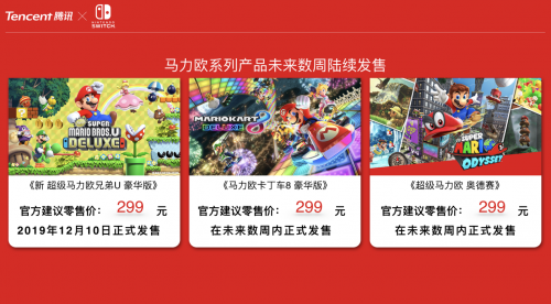 12月4日10时30分,主题为“为你的笑容而来”的国行Nintendo Switch?产品上市发布会,在上海正式举办。 发布会上,腾讯携手任天堂宣布,腾讯引进Nintendo Switch将于12月10日正式发售。国行版Nintendo Switch为续航增强版且预装《新 超级马力欧兄弟U 豪华版》体验版,官方建议零售价2099元,于12月4日中午12时在京东和天猫官方旗舰店开启预售。腾讯同时表示Nintendo Switch Lite的引进工作正在筹备中。 游戏阵容方面,发布会上表示,未来数周内会陆续把Nintendo Switch上的精品马力欧相关游戏带给中国用户。率先到来的是《新 超级马力欧兄弟U 豪华版》,官方建议零售价299元, 12月10日在Nintendo e商店正式发售,游戏兑换卡将会随后发售,实体游戏卡带将会在明年春节前后发售。《马力欧卡丁车8 豪华版》和《超级马力欧 奥德赛》会在未来数周内陆续推出,官方建议零售价均为299元。 除主机和游戏之外,本次发布会亦公布了amiibo?婚礼造型系列游戏互动模型,多种配色Joy-Con?、Joy-Con充电握把、Joy-Con方向盘、Joy-Con腕带,Nintendo Switch专业手柄、Nintendo Switch电源适配器、Nintendo Switch基座套装、Nintendo Switch充电支架、Nintendo Switch便携包等多款官方配件,以进一步丰富和增进用户游戏体验。 腾讯集团高级副总裁马晓轶、腾讯游戏任天堂合作部总经理钱赓以及作为邀请嘉宾的任天堂株式会社取缔役、专务执行役员高桥伸也共同出席了本次发布会,分享了腾讯引进Nintendo Switch的上市信息以及双方合作的进展。任天堂株式会社代表取缔役、专门领域开发主导宫本茂虽未亲临现场,仍通过视频形式向中国消费者问好,并发表感言。 腾讯携手任天堂:为中国用户带来更多笑容 “为你的笑容而来”,在一段充满玩家笑容的2019年 ChinaJoy Nintendo Switch展区回顾视频之后,马晓轶登台致辞,他表示,过去的半年以来,随着与任天堂合作工作的推进,双方亦师亦友,对于游戏在社会中应当承担的价值和意义,对于玩法创新和品质追求,对于游戏快乐本质的理解,有了更多的共鸣。马晓轶随后说到:“到今天,我们终于迎来了国行Nintendo Switch的上市。我们期待,它将作为一种全新的娱乐方式,丰富我们日常生活的娱乐选择,成为连接你我的新纽带。对腾讯和任天堂双方来说,这也意味着全新征程的开始。未来,如何让更多中国用户,体验到这台小小的游戏机背后无穷的乐趣,还需要我们彼此有更多的探索和尝试。” 马晓轶表示,秉承着腾讯游戏全新的品牌理念,“去发现,无限可能”,腾讯将会通过Nintendo Switch 让更多的中国消费者感受到“随心切换,一起趣玩”的快乐和无限可能,让游戏成为亲人朋友之间沟通的重要桥梁,帮助年轻人培养起健康的游戏观和游戏审美。让我们的“未来”更加健康、快乐地成长,也帮助家长们更容易和合理地平衡游戏娱乐和生活学习的时间;同时,腾讯也希望能够将任天堂的游戏理念引入中国游戏产业,共同推动中国主机游戏生态的发展和繁荣,为国内开发者基于Nintendo Switch开发游戏创造条件,也将以Nintendo Switch平台为载体,帮助更多优秀的中国游戏扬帆出海,让更多全球用户也能享受到中国游戏所带来的快乐。 随后,宫本茂通过视频形式,用中文向广大的中国消费者问好。作为“马力欧之父”,宫本茂阐述了任天堂创造、开发马力欧系列和其他游戏时所秉承的理念,他表示,在任天堂的游戏和主机开发中十分重视给用户提供全新且有趣的体验,同时更加重视让家人可以欢聚一堂,一起玩乐,致力于为消费者提供无论是谁都简单易懂、可以使心情变得愉快舒畅的游戏。最后,宫本茂说:“任天堂长久以来,一直希望可以为中国消费者提供任天堂的游戏娱乐,现在这个梦想得以实现,真的感到十分高兴,也十分感谢。” 一台主机三种模式 马力欧系列领衔首发 腾讯游戏任天堂合作部总经理钱赓结合生活中的真实体验,为大家介绍了国行Nintendo Switch的三种游玩模式,即电视模式、掌上模式和桌面模式。他表示,适合在家中客厅游玩的电视模式下,Nintendo Switch不仅有助于培养每一个家庭都希望拥有的默契亲子关系,也适合在家中款待好友,将两个人的快乐变为三个人的快乐,三个人的快乐变成更多人的快乐,在面对面的互动中产生更多的共鸣。同时,Nintendo Switch的极致便携性,可以让用户一个人尽情享受它所带来的快乐体验,亦能随时随地与更多人分享这种快乐。即便在外出的各种闲暇中,用户仍然可以随时随地享受Nintendo Switch的高品质游戏内容,无论是在外点餐的空闲,工作中高强度会议后的闲暇,抑或空中旅途,都能将Nintendo Switch置于桌面游玩,与同伴开启轻松一刻。 邀请嘉宾高桥伸也登台表示:“我们的开发人员,多年以来一直盼望能为中国顾客提供任天堂的游戏。” 随后他公布了本次腾讯引进Nintendo Switch的首发游戏《新 超级马力欧兄弟U 豪华版》,并介绍了《马力欧卡丁车8 豪华版》和《超级马力欧 奥德赛》。 《新 超级马力欧兄弟U 豪华版》是马力欧2D横轴动作游戏的代表作,马力欧和同胞兄弟路易吉在平原、大海、沙漠等机关重重的164种游戏路线中冒险。 在《马力欧卡丁车8 豪华版》中,马力欧和伙伴们乘着卡丁车,在各种车道中奔驰。用户可以与家人朋友一起对战同乐。 《超级马力欧 奥德赛》中,用户会化身马力欧,与有附身能力的帽子国伙伴凯皮一起,乘着飞行船奥德赛号,以未知的国度为舞台,展开冒