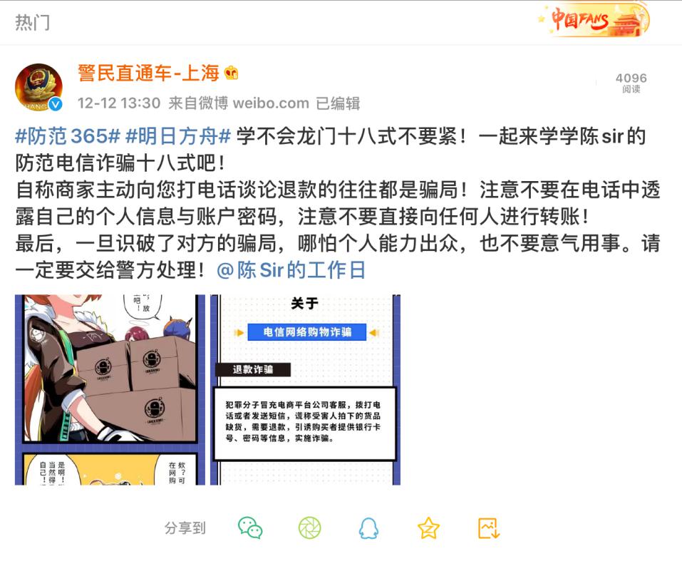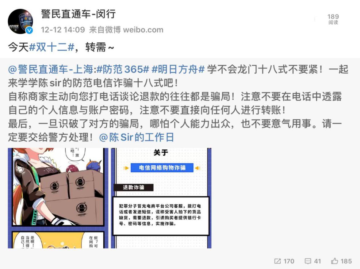 近日,上海市公安局官方微博@警民直通车-上海与《明日方舟》人物陈Sir的微博@陈Sir的工作日联合发布公益漫画,旨在提醒广大群众和玩家防范电信网络诈骗。 虽然从日常来说,人民警察和手机游戏这两个词往往只能同时出现在“熊孩子给手游充八万”这种社会资讯里,完全是两个世界的角色。不过得益于《明日方舟》中“陈Sir”警官的形象,这次联动十分的接地气。 联动宣传漫画中,“陈Sir”一眼看穿了“可颂”购买“龙门十八式”而被所谓客服人员所要保证金及账号密码的电信网络诈骗陷阱。 根据相关资料显示,网络诈骗频繁发生的年龄区间主要集中在二十到三十岁之间的青年人中,本次《明日方舟》“@陈Sir的工作日”与“@警民直通车-上海”的公益联动漫画将现实生活中常见的电信网络诈骗手段与游戏角色一同演绎,在符合人物设定的同时软性植入了“如何防范电信网络诈骗”以及“电信网络诈骗的常见手段”宣传,本次联动取得了良好的宣传效果。 网友们纷纷表示“硬核联动!!!”、“梦幻携手”、“我什么联动没见过? 这联动我真没见过?” 相关警方微博也相继进行转发 这并不是第一次警企合作,在今年10月8日,上海警方多家水上派出所与RNG电子竞技俱乐部一起看望了幸福敬老院的老人们,送上了重阳糕等礼物,身体力行地努力提升老人们的获得感和幸福感,积极实现老有所乐、老有所为,共建共享新时代的美好生活。 这也不是一次简单的警企合作互动,《明日方舟》IP的母公司上海鹰角网络科技有限公司作为一家富有社会责任感的年轻网络公司,十分关注今年来高发的电信网络诈骗案件,在自己熟悉、擅长的手游漫画领域内,宣传“防范电信网络诈骗”,不断提高玩家的自防意识。 这次活动的举办,为政企公益合作以及公益宣传提供了新思路,游戏在作为日常消遣的同时,也肩负起了向社会传播正能量的积极作用,值得称赞的是这次联动打破了人们以往对于政府宣传工作的刻板观念,引入人们喜爱的文化进行软性宣传,其社会影响不仅仅是宣传“防范电信网络诈骗”那么简单,也代表着这种手游文化逐渐被社会所慢慢接受,游戏并非洪水猛兽,正确看待就能大有所获。 上海警方与《明日方舟》的联动,提供了一个非常良好的政企合作开端,双方“打破次元壁”一同打击电信网络诈骗、提高防范电信网络诈骗的意识,日后是否在游戏中会出现更多形式有趣、有意义的联动呢?各位刀客塔们不妨拭目以待 |