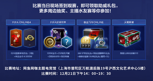 12月21日,网鱼竞技场×腾讯体育游戏全国总决赛即将在上海拉开序幕,《FIFA ONLINE4》、《FIFA足球世界》、《极品飞车OL》、《火箭联盟》全国最强选手集结网鱼网咖主题电竞馆,向最高荣誉发起冲击!人气解说管泽元与FIFA OL系列官方解说yoyo裴优领衔七大官方解说现场助阵,观赛报名正在进行中,助威礼包、周边抽奖、主播水友赛等你来参与! 12月初,网鱼竞技场×腾讯体育游戏城市赛的战鼓正式敲响,《FIFA OL4》、《FIFA足球世界》、《火箭联盟》、《极品飞车OL》四款全明星腾讯体育游戏悉数开战!本届比赛覆盖全国上海、北京、广州、成都、武汉、深圳、沈阳、大连、天津、西安、南京、郑州12个城市,吸引了全国两千余名玩家报名参赛。 历经海选赛、城市赛、全国淘汰赛的层层对战,最终来自网鱼网咖上海昌里路店、北京西单店、成都龙舟路店、武汉银泰创意城店、广州佳润广场店、郑州师范学院店、天津米莱欧店、上海闵行交大店、西安新世界店、北京枫蓝国际店、南京时尚莱迪店的近二十位选手脱颖而出,即将征战全国总决赛! 全国总决赛将于12月21日(本周六)下午2点在网鱼网咖主题电竞馆(普陀区万航渡后路19号沪西文化艺术中心5楼)正式开赛。人气解说管泽元与腾讯体育女主播yoyo裴优、携各游戏解说将在线下与现场玩家一同见证全国冠军的诞生。邀请各位玩家亲临现场观赛,签到即可获得游戏礼包!现场更有周边抽奖、主播水友赛,可谓福利满满!数量有限,先到先得哟~想和管哥在球场上一拼高下吗,千万不要错过啦! 线上玩家也可以锁定本次赛事特约直播合作伙伴——斗鱼直播、企鹅电竞,或前往比赛专题页面参与互动赢好礼! 在这个圣诞来临前的周末,相约网鱼竞技场,来一场热情的玩家线下聚会吧! |