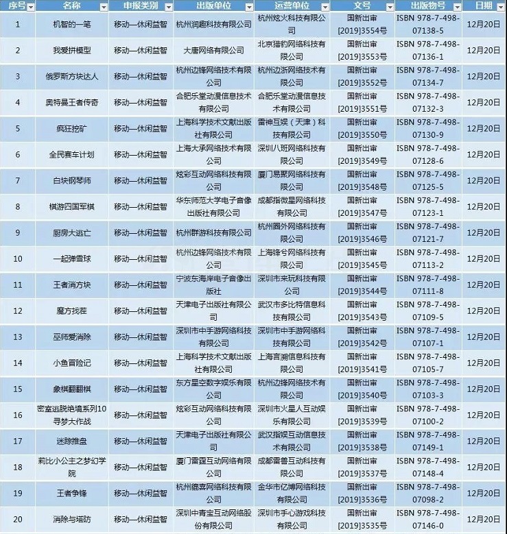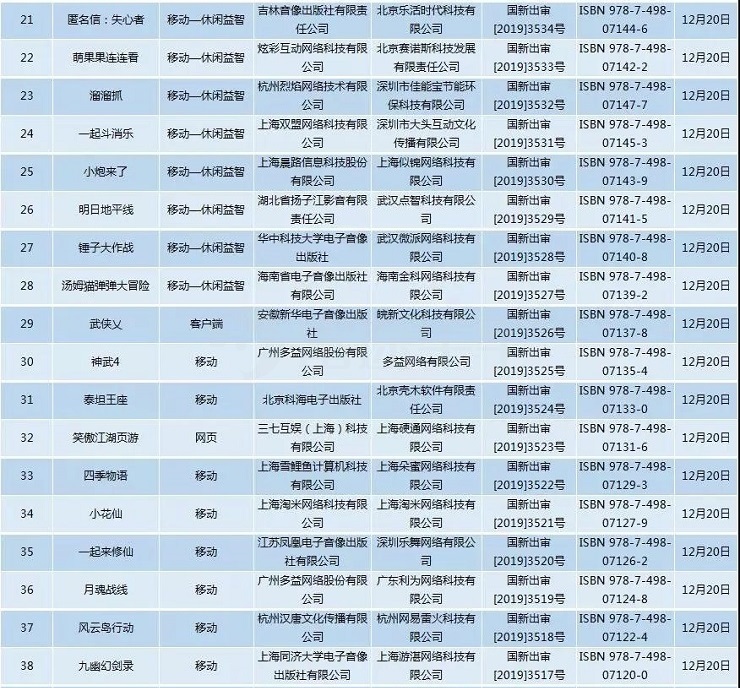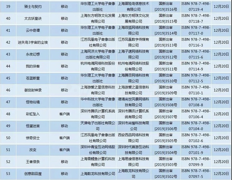 12月20日,原国家资讯出版广电总局官方信息显示,新一批国产游戏版号在中国游戏产业年会圆满落幕后,如期而至。本次共有53款游戏获批,其中多益网络的《神武4》、腾讯的《彩虹坠入》、网易的《风云岛行动》、三七互娱《笑傲江湖页游》、、电魂网络的《我的侠客》、盛趣游戏的《创意甜品屋》等。 本次版号的归属很分散,同一家厂商获得多款版号的情况并未出现。 现将53款完整过审游戏名单展示如下: 从名单上去看,多益网络《神武4》算是此次版号名单中最大牌的产品。早在今年6月份,就已爆出《神武4》正在路上的重磅消息,而在2019ChinaJoy上,官方也曾透露《神武4》将采用全新的引擎制作,除了美术特效、时装系统的全面升级,游戏的首个3D场景、动态天气等玩法也会来临。 网易《风云岛行动》同样获得通过。作为一款网易旗下雷火工作室自研的英雄套路生存手游,《风云岛行动》将东方幻想列为其主要题材,玩法方面创新性的将「动作格斗」和「生存套路」相结合,算是战术竞技玩法的别样演绎。 而腾讯取得版号的产品《彩虹坠入》并非手游,而是一款端游。《彩虹坠入》由腾讯旗下颇为出名的工作室NEXT Studio打造,本作以灰暗为基调,穿插了光影转换的主轴和维多利亚风格的场景,呈现出一幅别样的黑暗童话。为了在谜题的设计上则更为专注,本作选择完全放弃动作元素,此举使其避免了喧宾夺主的尴尬。 但综合看来,休闲游戏仍占据多数,且本次版号名单中通过的产品品类丰富。既有益智组合模型解谜游戏《我爱拼模型》,有顶着经典玩法再次演绎的《俄罗斯方块达人》,也有休闲魔性挑战类游戏《厨房大逃亡》,以及消除类产品《巫师爱消除》。传统棋类产品自然不可缺少,有《棋游四国军棋》和《象棋翻翻棋》为其撑起门面。 就在昨日的中国游戏产业年会上,中宣部出版局副局长冯士新表示,今年以来,国家资讯出版署已批准出版运营游戏1468款,基本满足了企业正常发展需求。未来,将进一步改进审批流程,在总结已有经验的基础上,有序扩大属地管理审核试点,更好发挥属地管理部门积极性,提高审批工作效率,让内容健康有益的产品能够有序快捷地上线运营。 |