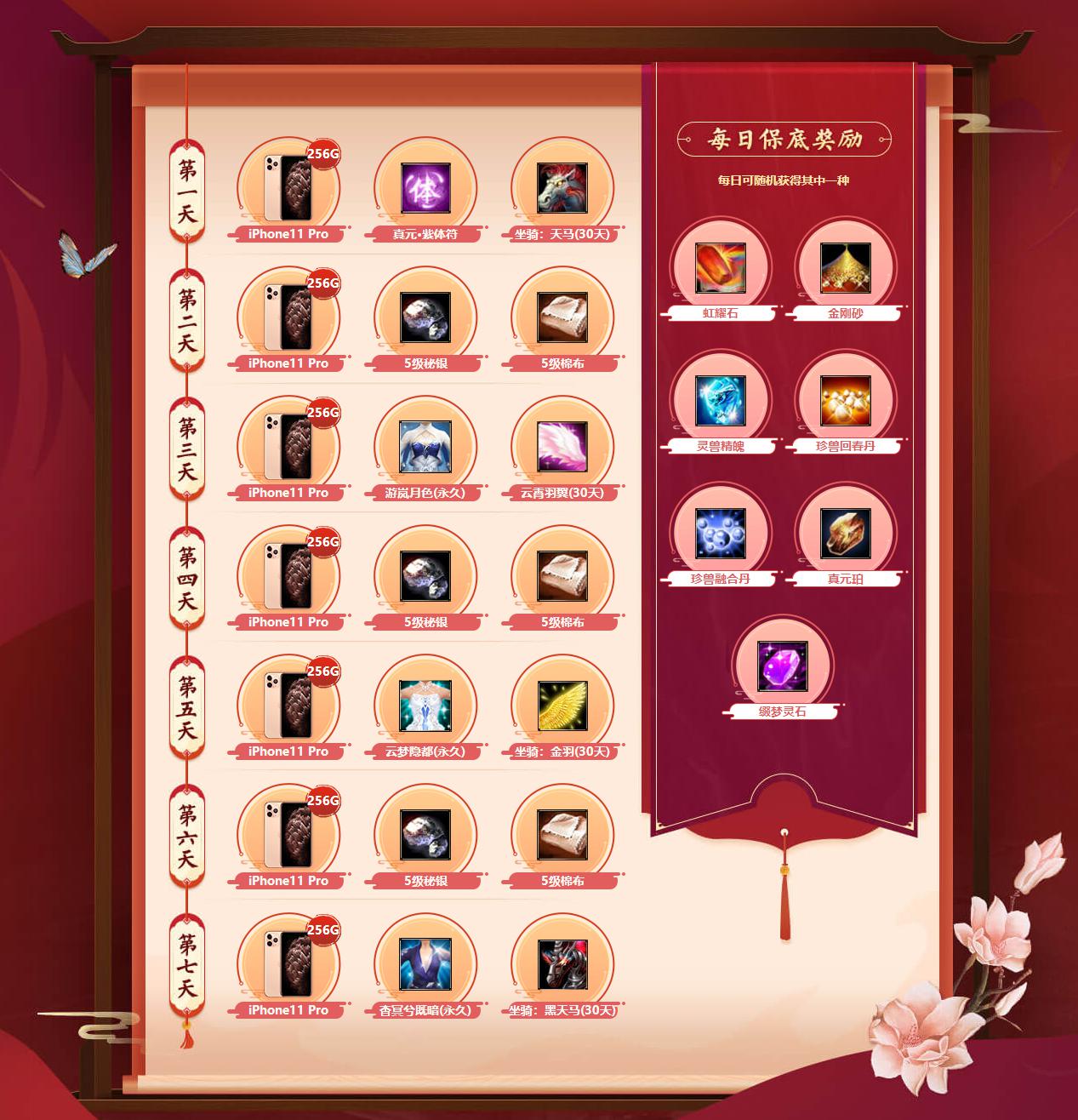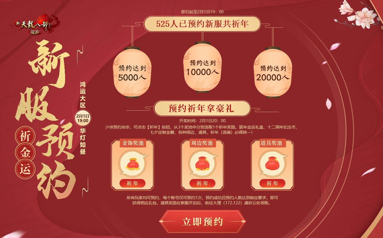 开年贺新迎金运,2020年首服【鸿运大区-华灯如昼】将于2月1日19:00正式开服引爆鼠年福利,邀请少侠共赴新年新征程!不仅有5级棉布、5级秘银、2700资质定制龙蟒、iPhone 11 Pro等豪礼,现在预约即有机会获得中国黄金合作鼠年贺岁金,还有预充值活动内藏龙凤长相依礼盒及新服排队绿色通道资格,机会难得不容错过;开服拼团特供,时装:熹年画中人团购券,让你的衣柜不再遗憾;新服预约活动、江湖同归活动等多项新服独享活动引燃江湖!万千宠爱集一身,鼠年新服等你来战! 【预充值领豪礼,基金扶持计划启动】 新服预充值送新年特供礼包活动,预充值600元、1500元可分别获得侠名初现礼包、声名鹊起礼包,当预充值3000元时,还可获得名动四方礼包及排队绿色通道资格哦~ 持有礼包的少侠在开年新服消费达到对应元宝要求后,便可至大理(165,171)陈星福处领取相应礼包奖励,每个礼包内皆含有数量不等的金铢宝袋,1个金铢宝袋可开启500金铢,金铢可在百戏集市中用于商品砍价,直接抵扣元宝。开启声名鹊起礼包更可获得龙凤长相依礼盒(内含2件)! 【开年拼团特供】 想必有少侠都有过与心仪的时装失之交臂的懊悔时刻,这一次让你的新服之旅不再有遗憾。预充获得拼团资格,拼团到达指定人数,即可获得团购券,可在新服开启后,前往大理(165,171)陈星福处,使用团购券,以超低价格购买参与拼团的心仪道具。时装:熹年画中人(永久),新服仅拼团可得,机会仅一次千万不要错过! 小提示:请勿将团购券丢弃,否则将无法折扣购买道具! 【预约有礼,开年豪礼助成长】 活动时间:即日起至2月1日19:00 参与预约还可参与【祈年】活动,点击活动页面上【祈年】按钮,便可从金饰、周边、道具三大奖池中各选其一进行祈愿,金饰奖池中除了有纪念金币、宋制金簪外,更有全新鼠年金运礼盒身藏其中,意义非凡,不容错过!当三个奖池皆选定了心仪奖励后,在2月1日20:00开奖时将必得其一! 【故人共醉,同归江湖】 活动时间:即日起至2月1日19:00 故友的到来总能给这片江湖增添一份特别的温情,2019年12月25日后再未登录过游戏的少侠(同一身份证和认证手机下无任何账号在此之后登录,且游戏内有历史消费,最高角色等级 ≥50级 ),预约新服到达3000人新服所有玩家均有几率获得玄灵丹、玄灵丹*5、坐骑:栖凤歌(7天)、缀梦灵石*2外,更有几率获得重楼肩! 【新服在线抽奖,iPhoneXS抽不停】 活动时间:2月1日~2月7日每天21:00、21:15、21:30 活动时间内新服玩家均可在服务器进行抽奖,所有参与抽奖的玩家都有机会中奖!除了5级秘银、5级棉布外,新服每日送出一部iPhone11 Pro(256G)!机不可失,没准下一个锦鲤就是你哦~ 【新手欢乐月,顶级定制龙蟒等你来拿】 新服新起点,在新服内创建角色之日起30天内,完成新手嘉年华中的活动,即可获得豪侠值,超多好礼等你兑换:资质2700的顶变龙蟒、真元·橙体符、3级宝石……快在这片新江湖施展拳脚赢得属于你的荣誉吧! |