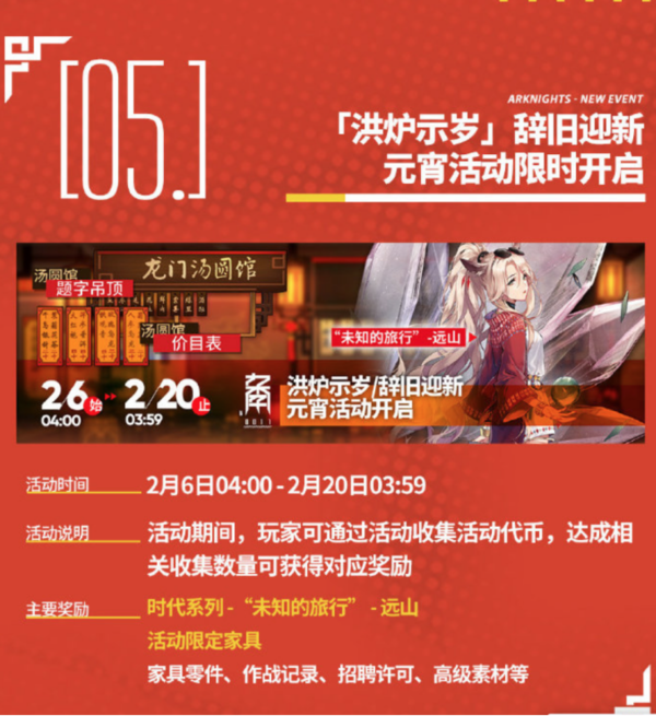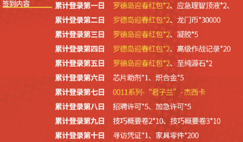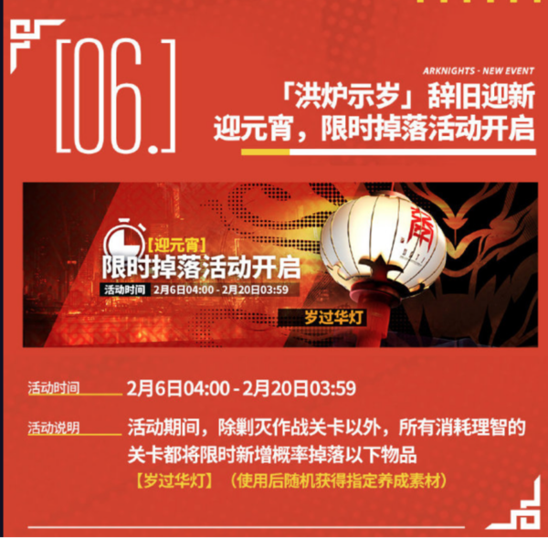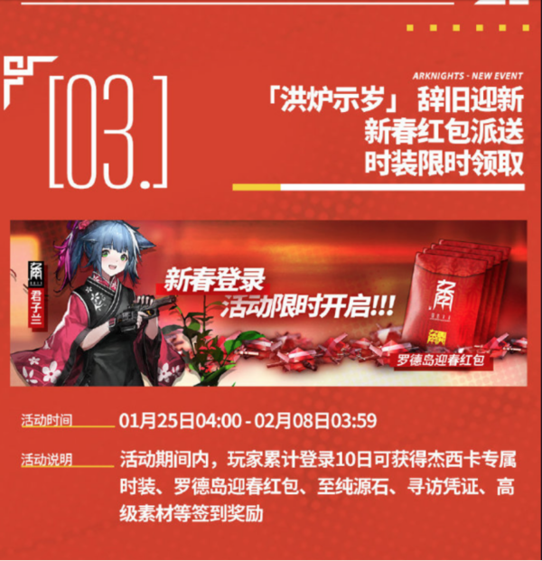 转眼间新年和元宵将至,开服半年多的热门手游《明日方舟》迎来了它的首个新年。第一个年头,《明日方舟》手游可谓是在手游界掀起了莫大波澜,恰好近期又赶上了外服开服,相信鹰角也是十分忙碌。 官博近日公布了春节期间的活动安排,可谓是开服以来最大的一次福利活动。 活动1,限时领取十连券,在1月20日至1月25日00:00,登陆游戏即可在邮箱内找到官方赠送的奖励。同时本次奖励领取堪称0门槛 只要是在1月25日00:00活动时间内注册的账号,都能领取,也就是说游客账号也能够领到。 活动2,特别登录奖励,这一活动仅持续4小时,从1月24日20:00到24:00,不同时间段会收到不同干员的邮件赠礼。通过活动banne能够看出,奖励里面除了理智液、家具零件还有合成玉。 活动3,这个活动在1月25日4:00点才回开启,一直持续到2月8日的3:59,其实就是个签到活动,一点也不麻烦但奖励颇为丰厚。在规定时间内,累计登录10天中,每天都能够获得不同的奖励,在累计签到第七天会给杰西卡的新春皮肤。而这个签到活动最吸睛的当属“罗德岛迎春红包”,签到累计五天总共给10个,首次开启给800个合成玉,之后会从200、300、500、800四个数量中随机奖励,也就是说在这次活动中最高能够拿到8000玉,最低也有2600块合成玉。 活动4,送完奖励之后便是较为常规的操作 在2月6日-2月20日期间,物资筹备以及芯片关卡全天开放,相信会被玩家刷爆。 活动5,与活动4的开放时间相同 第五个活动算是常规意义上的“活动”了,收集素材达到一定数量领取奖励。 但值得一提的是,其这次公布的远山皮肤美爆。 虽然在战力设定上鹰角一直坚持的星数高低决定实力高低,但颜值没有星级。 活动6,限时掉落活动。同样是在2月6日开放的活动,除了剿灭关卡之外,所有消耗理智的关卡都会新增掉落“岁过华灯”,打开道具能够随机获得指定养成素材。 本次新年活动的奖励不可谓不丰厚,无论是抽干员还是红包抽合成玉,里面都是满满考验欧气的操作,新年这波就看大家的人品啦。而随着活动推进还能观看洪炉示岁后面的剧情,就等着看罗德岛一众脱线干员能有着什么样的精彩表演吧。 |
