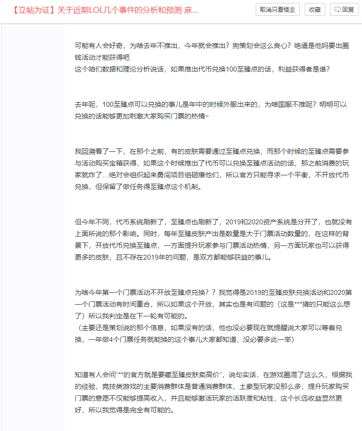 之前闹得沸沸扬扬的王国机神皮肤引起了很多玩家的不满,像小编这种玩家闻到风声也跑过去吃了一波瓜其实撇除一些见仁见智的解释,更多的玩家表达的不满都在于认为皮肤的“年味”不够重,说好的鼠年限定没有“鼠”之类的,甚至国内外服的价格也有所区别,可以说是此次事件让很多玩家感到不爽。 话又说回来,其实ch这些奇怪操作也不是一两天的了,但最近小编在贴吧看到一个帖子,一位神秘大佬就爆料分析了最近LOL的皮肤事件跟接下来的神秘活动。不过大家最关注的就是他预测下个门票活动会开放代币兑换至臻点。 这个帖子主要点评了王国机神皮肤、B站幼儿园UP主的几个问题,然后做了一个预测:下个门票活动,官方可能会开启代币兑换100至臻点的内容。 关于王国机神,今年的皮肤虽然也是给中国玩家做的,不过和过往的春节皮肤风格差异过大,而且还没有老鼠,这自然会让玩家觉得很不爽,毕竟很多玩家心里,还是希望有一款真正的充满“年味”的中国风春节贺岁皮肤。 后续大佬也认为, TX官方应该会跟拳头沟通,去推动明年的皮肤计划按照春节年味儿的做。但这个明年的事,大家就到时候看吧。 除开闹得沸沸扬扬的皮肤事件,最近,英雄联盟策划贾克斯发微博表示接下来会有关于至臻点的活动,很多玩家也在猜测到底是什么。 那这次大佬的帖子里也提到了关于ch微博上说的内容,并且详细地分析了推测这个活动的理由。 去年100至臻点为什么没开兑换活动呢,主要是在那个上线之前活动有些皮肤是至臻点兑换的,而那时候至臻点是需要购买活动宝箱获得的,所以那会儿推出这个活动的话,怕是会引起很多氪金的玩家不满,所以官方是保留了做任务获得至臻点这个部分。 但是今年开始,代币系统进行了刷新,至臻点也变更了,2020的资产系统与往年分开,之前的问题也就迎刃而解。通过大佬的分析,大盘上看,提升更多玩家参与门票活动对收益和活跃都有帮助,玩家也能获得更多皮肤,对两边都是有好处的,在这样的情况下看,这个推测确实有可能。 最后想说下,对比外服咱们真没必要那么卑微,总有人都觉得国服价格都比外服贵,其实咱们的一些皮肤也是比外服便宜的,比如阿狸、灌篮高手这些,各个地区都会有一些本土定位比较高价值的皮肤,而且咱们的周年庆和冠军庆典都送皮肤图标什么的,这些也都是老外没有羡慕不来的,不用觉得外面的月亮圆,咱们只要争取到咱们有好的福利就行了,也希望TX能多上点心。 最后,小编也希望大佬的预测真的成功吧,毕竟代币兑换至臻点能有的话就真香了,要是没各位也可以去半价吧撕他,这位大佬也立了FLAG,要是没开放的话就抽皮肤安慰大家,走着瞧呗! |