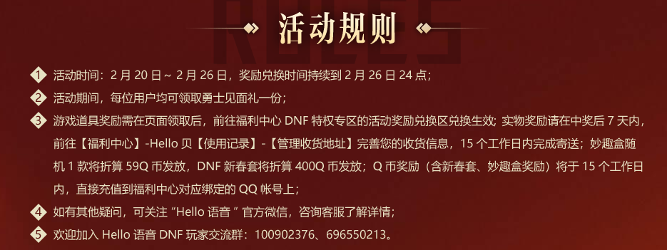 Hello语音马上要开放DNF的活动了,应该不少勇士都准备在Hello语音薅一波羊毛吧?这活动力度挺大,脸再黑的非酋也能恰个7天的黑钻吧,运气好的欧皇更是能直接撸一套新年套甚至是一台Switch!这几天,我搬完了砖就在研究这个活动,倒也有了点成果,这里就简单说说撸年(hei)套(zuan)的技巧。 首先,新春这么多活动,咱为啥就撸Hello语音呢?因为跟其他抽奖活动相比,Hello语音的这个抽奖最大的优势就是门槛低,注册了账号就能在他们APP上领到7天黑钻低保,抽奖机会更是简单,每日登录和分享、答题就能抽,完全不用氪金,拉人头也不是硬性要求,可以说是有手就能捡的便宜! 这里给大家大致的算算收益:我们现在只知道奖池里的奖品,每个奖品的中奖率还是个迷,但Switch、年套和妙趣盒中奖率应该极低,但剩下的200贝、通行证、3天黑钻、7天黑钻、5Q币这几个奖品,倒也值得一撸。 我们就按50%道具、50%Hello贝的几率来算的话,如果每天都参与拉人头之外的全部活动,2月20号到26号一共7天就能搞1260分,能抽16次(见面礼送1次抽奖)。其中大概有6--7次道具,1次Q币,其他的Hello贝也能换强化器、装扮合成器等道具,预计平均收益是15天黑钻+3Q币+2个通行证+强化器+装扮合成器,这波白嫖你嫖不嫖! 说到这里,你明白了吗?就按这么粗糙的算法都可以一口气撸到和DNF有关的各种奖励!真要运气来了,只要动动手指,就能撸空它的奖品库!这里还要提醒大家,26号是活动最后一天,那天晚上12点兑奖也截止了,不要压到最后时刻抽奖,血的教训! 勇士们,别寻思别的了,下载个Hello语音开启活动之旅吧! |