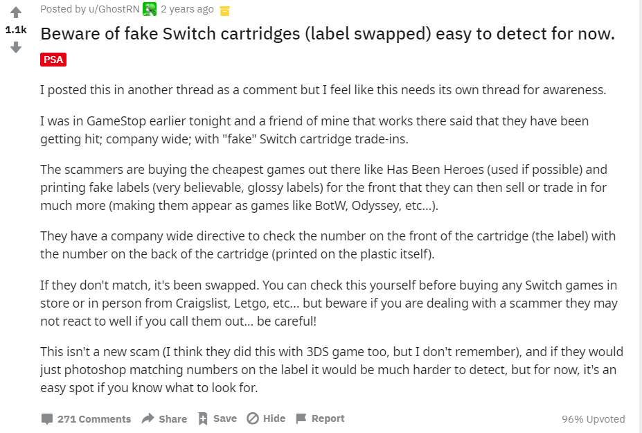 一个玩家间的都市传说,由一则社会资讯揭开了谜底。 自2017年任天堂Switch发布伊始,就有一个关于NS实体游戏卡带的传言,风靡于国内玩家之间: “你知道吗,你手里的NS卡带包装盒很可能是假的。” 这里说的包装盒,不止是用来固定NS游戏卡带的那个塑料壳,还包括内置的封面与说明书,以及外裹的塑封薄膜。换言之,是除了游戏卡带本身以外所有附件的总和。 而所谓假盒,则是塑料薄膜为二次塑封、封面和说明书是非官方打印,甚至可能连塑料壳都不是原装,而是来历不明的替代品。 事情一开始,只是有些玩家发现自己拿到手的游戏包装盒塑料偏软质地差,封面印刷模糊有色差,塑封材料又不够规整贴合,由此怀疑自己可能买到了假盒游戏,不过这些困惑大多被当作是疑神疑鬼,毕竟实体盗版游戏已经基本灭绝了,既然游戏卡只要能玩就不会是假的,又有多少人会去在意包装盒真不真呢。 但随着NS愈发普及,越来越多人注意到了这一现象,通过比对和总结,也有公认的证据浮上了水面。 1 2017年底,《异度神剑2》上市。因为出货量小、玩家口碑高,加上只有日版和港版才包含中文,它的卡带在国内一时洛阳纸贵,可说是NS上的第一代“理财产品”。 但很快,有些玩家发现自己买到的游戏包装不太对劲。 这里我们以一个2017年首发日版《异度神剑2》的包装盒为例,先看看原装正版的盒子细节是怎么样的。 当我们打开一个NS卡带盒,可以在正中的盒脊上半部分找到浮雕印刷的“Nintendo”标志;而在底部靠上则可以看到同样浮雕印刷的“HAC-009”字样。 根据官方文档的说明,这是任天堂家对自家产品的编码,“HAC-009”代表NS游戏卡盒,在游戏卡带上则刻有"HAC-008",这两个标识是任天堂多年以来的传统。 而再靠下一点的位置,则是聚丙烯塑料回收标识,形状为被三个箭头构成的三角形包裹的“5”,下方还注有“PP”字样。与上面两个编码不同,回收标识雕刻在包装盒的另一面,所以从内侧看起来其实是镜像的。 然而,一些网友却发现自己购买的“全新”游戏包装盒上缺斤少两,有的漏了logo,有的没印上“HAC-009”,甚至连PP5标识都错印在了盒脊内侧。 还有一个细节,则是“Nintendo”的印刷字体。 从1967年开始,任天堂就确立了自家logo的基本字体,其最显著的特点,是字母“i”上面的小点是一个四角方形而非圆点,字母“o”则是一个正圆形内嵌了一个竖椭圆。 然而有的包装盒上虽然印了“Nintendo”字样,用的却是一般的常见字体。 显然,在正常合规的官方生产体系里,这些错误都是不太可能出现的。于是这些有硬伤的卡盒被当做了调包现象存在的铁证。而通过上述细节来辨别自己手上的卡盒是否为原厂生产,也成为了一时流传最广的鉴定方式。 随着时间推移,一边是越来越多玩家关注起卡盒的真假问题,有些玩家买回游戏卡带的第一件事就是拍照发到网上求问是否为真盒,网友们则从各种细节入手寻找蛛丝马迹,颇有球鞋爱好者们鉴鞋的架势;另一边,则是用来替换的假盒也越做越逼真。 在电商平台,我们很容易就能找到贩售中的假盒货源,单个价格在三到十元不等。随着假盒的制作工艺已经针对玩家们的鉴定体系做了改良,已经很难通过外观来断定盒子的真假。 识别真假盒已然成为了国内NS文化的一部分。 如此关心自己手上的游戏卡带的包装是否为原装,这事乍看有些买椟还珠的意味,但其中的逻辑并不难理解——既然包装壳被偷梁换柱,那自然也就无法确保里面装着的卡带仍是全新的,最坏的情况那就是有奸商拿二手卡带充新贩售。 这也是最早大家对于假盒现象的解释。同一个NS游戏,二手和全新的差价通常在三十元到五十元,而像《异度神剑2》《秋之回忆8》这样奇货可居的游戏,差价更可高达上百元。利润空间显然足够吸引不良商家将收购来的二手游戏重新塑封包装,当成全新的卖。 要判断自己买到的卡带是否可能为二手,除了包装以外还有两个常见方法。 一是发售一年内的实体NS卡带都可以像这样通过对应版本的Eshop领取任天堂点数,也就是俗称的金币。 如果一张游戏卡在领取过程中提示“已获取该软件的My Nintendo点数”,那么就基本可以断定为二手。但这并不代表可以领取金币的卡带就一定为全新,也有许多玩家出于各种原因没有领金币的卡带流入二手市场,同样可能被包装为全新出售。 而另一个入手点,则是NS卡带外露的金手指部分材质较软,只要插入过游戏机运行,就难免会在表面留下划痕,因此也被用于判断卡带是否为二手。 然而,从NDS时代起,全新卡带金手指上出现划痕的情况就屡见不鲜,海外论坛也有同样不乏对于这现象的讨论,因此大家推测部分全新卡带也可能在出厂过程中遇到抽检或是工艺问题而留下了划痕,所以即便有划痕也不能就断定为二手。不过,任天堂从未公开回应过此事,终究是一桩无头公案。 2 总之,虽说不上铁证如山,但大家都相信假盒的出现是因为有奸商在拿二手游戏充新。 然而更诡异的事发生了,有不少玩家发现自己第一时间买到手的首发游戏也出现了明显的假盒现象。可以正常领取金币,金手指上也没有划痕,从时间上讲也不存在二手倒卖的机会,偏偏这盒子怎么看都是假的。 这又是怎么回事?这一回,卖家们侵吞游戏特典的行为成为了众矢之的。 游戏特典是为了促进游戏刚发售时的实体销量而捆绑的小赠品,通常分为店铺特典和内置特典