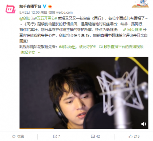 5月5日,王者荣耀玩家的狂欢节日“五五开黑节”正式到来,为了打造游戏界双十一,《王者荣耀》官方与五位王者大神联手献唱,剑仙、梦泪、呆阿拿、孤影,和天赐组成王者峡谷声守护团,每个人都献唱了一首歌曲。 其中剑仙带来了一首治愈情歌《守护》与“西瓜们”见面,歌曲中讲述了剑仙与粉丝们一路并肩,成长的路上一路同行的故事,获得西瓜们的彩虹夸赞。 作为游戏主播里最会唱歌的男主播,剑仙的歌曲从没让大家失望,这次也让许多西瓜们高呼好听。而且与其他大神相比,剑仙这首歌的完成度都是最高的,体现了剑仙的vocal实力。 而在5月2日发布当晚,剑仙直播间也抽送了各种单曲CD和签名照,并在直播中分享了自己的录制感受,在高音遇到困难时,剑仙没有放弃,而是与音乐老师不断求教,多次联系后,还是呈现出了一首高质量“王者情歌”,不过在直播当天剑仙高音翻了车,被西瓜们无情记录,但还是用磁性的嗓音演绎了《同行》这首歌曲。 在直播中把粉丝们当家人,呈现真我,这也是一直以来剑仙的魅力之一。很多人因为“龙坑李白五杀”入坑剑仙,陪着剑仙拿下了10个国服英雄,听剑仙一首一首发布10首单曲,剑仙也从游戏主播逐渐在综艺,音乐涉猎,成为少见的多元化电竞偶像。 而王者荣耀和触手平台也给足了剑仙资源,前段时间的《触手剑仙杯》以及王者荣耀的原创内容大赛都是王者荣耀找到剑仙,认为剑仙可以更好地触达游戏受众;此外,触手直播也与腾讯达成版权合作后,开展了多个资源合作,比如剑仙与李汶翰在《终极高手》中一起打游戏,相关话题破2000万; 在《玩游戏的朋友》中,剑仙多次上演精彩操作,可以说剑仙作为TOP主播享受到了触手给出的最高资源等级,基本上所有资源首推剑仙,剑仙也自然享受到了与腾讯合作的直接红利,这是其他平台都无法给到的。 作为一名知名主播,剑仙与触手一步一步走到今天,也有理由相信接下来剑仙会带来更多有趣的直播内容和音乐作品。 |