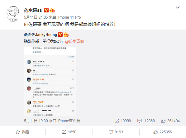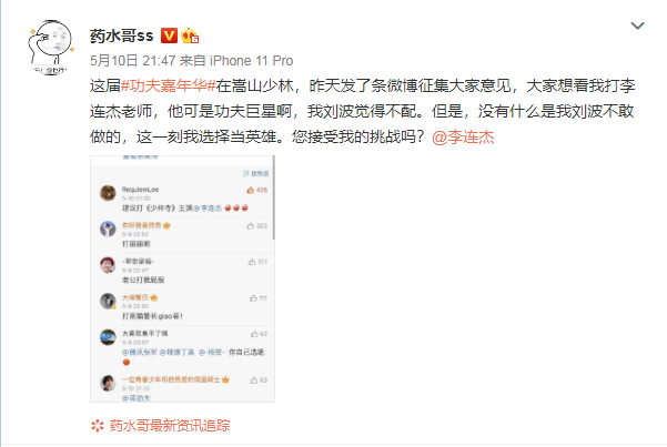 5月10日,网红药水哥在微博@李连杰,希望能够在嵩山少林寺一较高下。该微博发出后,第一时间并没有引起太高关注度,因为网络世界虽然无奇不有,但没人会相信功夫皇帝李连杰,会答应一个网红真人打擂的邀请。 然而就在大多数人都认为这只是药水哥的单方面口嗨时,故事才刚刚进行到序章。微博评论区里获赞最高的一条回复,随即就将另一个主角,李连杰的徒弟引了出来。 高赞评论所说的李连杰徒弟,就是功夫演员向佐。而药水哥想要“干碎”的对象,也从李连杰变成了向佐,后续就连向佐的母亲向太都在微博上参与了互动,这也预示着一场跨界battle正式拉开了大幕。 昨天中午虎牙直播发出公告,称已经应大家的要求,邀请到了向佐和药水哥参加新一届的功夫嘉年华。此刻就算是再后知后觉的人,也清楚之前发生的一切都是有剧本的。 不过即便如此,也不影响不了主办方和参与者继续为跨界battle造势。 就在今天中午,“向佐让药水哥买保险”的词条登顶了微博热搜榜榜首。已经隔离完成,戴着墨镜一脸冷峻的向佐,希望在正式交手前药水哥能买好保险在出战。 自古以来江湖上无论是文斗还是武斗,双方互相撂狠话都是常规环节,向佐的这波微博喊话,则将两人之间对决的话题度推向了顶峰。 网红vs练家子,明眼人一看就知道结果会是怎样的。网友们的热情空前高涨,对这场比赛表现地极为期待。当然,大家并不认为励志电影中,小人物以弱胜强的故事会发生在他身上。即使是药水哥的粉丝,想要看到的也只是“收棺之战”。 药水哥何许人也?他最早是一名英雄联盟主播。但最终让他火起来的却不是游戏,而是难以用言语来形容和表达的“抽象艺术”。 正常直播游戏时他只是不温不火的小主播,而一次与黑粉的连麦互喷却让他发生了转变,两人就用一句“您配吗?”唇枪舌战了5个小时。药水哥则从中发现自己表现地越乖张,观众就越多,渐渐地他就从英雄联盟主播变为了现在的“抽象艺术家”。 药水哥直播间的观众并非真喜欢这个人,大部分人只是想看镜头前的药水哥能整什么样的活。荒诞、滑稽是药水哥表演的主要元素,而他也因此把自己的人设给立住了。 言归正传,当看到“挑衅他人”、“对方应战”、“网上互掐”、“场上整活”这样的流程时,许多网友都会有似曾相识的感觉,因为去年药水哥就是用同样的方式去挑衅一龙的。 那时的粉丝们也同样怀着“收棺之战”的决心,来看待这场选手实力相差悬殊的比赛,甚至还给药水哥定下了“能活着下台就算成功”的小目标。而比赛的最终结果,也并不像大家想象中那样以一龙暴打药水哥告终。双方在场上的交手,甚至还一度表现出势均力敌的感觉。 那场对决一龙赢得了比赛,药水哥则赢得了一个吻。 一年时间过去,熟悉的配方又回来了。只不过这一次药水哥的对手从自由搏击运动员一龙,变成了曝光率更高的功夫演员向佐。 “网红约架功夫明星10秒就遭KO” 的故事注定不会发生,观众们大概率还是会看到一场节目效果拉满的技击表演。期待到了当天,药水哥能给大家整几个好活吧。 |