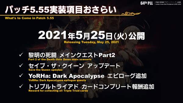 在今天的《最终幻想14》粉丝节活动上,SE公布了《FF14》2021年的后续更新时间表。5.55版本“黎明的死斗Part2”将于5月25日上线国际服,届时与《尼尔:机械纪元》的联动任务“寄叶异闻”也将推出新任务。此外在当天PS5版本的游戏也会上线。 此次5.55版本的更新概括为以下内容: -天佑女王相关更新。 -新增主线任务。 -尼尔联动新篇章开启。 -九宫幻卡全收集奖励追加。 -分解蛮神素材系统优化。 -增加新庭具。 《最终幻想14》5.57与5.58版本也会随后到来,而8月份将会举办红莲祭与新生祭,9月则会复刻与《最终幻想15》的联动,错过衣服与跑车的小伙伴们可要注意了!11月份则是最令人关注的6.0版本上线国际服,PS5版本同步,粉丝们可不要错过了。 |