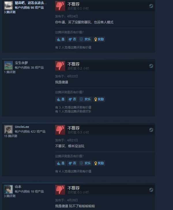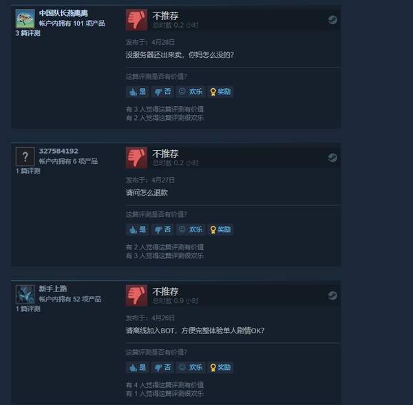 Steam上玩家对《泰坦陨落》服务器的吐槽就没有断过,点开最近的评价,差评依旧是指向于此。近期评价也都是在劝退其他玩家不要买这款游戏,因为服务器找不到。
