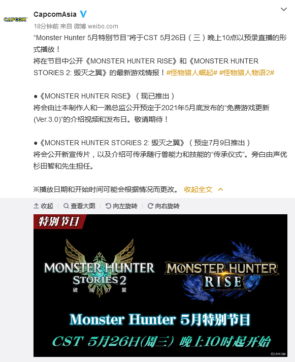 卡普空旗下的《怪物猎人物语2:破灭之翼》将在今年7月9日推出,提供亚洲版及繁简中文字幕。日前,卡普空公布了本作的中文版剧情PV。玩家将通过故事和任务,去体验“MONSTER HUNTER”世界。一起来看看这个中文PV吧! 中文版剧情PV影像: 《MONSTERHUNTERSTORIES》是一款让玩家化身为能够与怪物建立牵绊、培育怪物、与怪物共存的“怪物骑士”,造访各种各样的地方,通过故事与任务尽情体验“MONSTER HUNTER”世界的RPG。 而在最新作品《MONSTERHUNTERSTORIES2》,在这个所有火龙都已不知去向的世界里,继承了伟大骑士“烈度”之血缘的主角与被托付了龙蛋的龙人少女艾娜实现了命运的相遇,这个围绕着“破灭之翼”展开的故事也就此揭开序幕。 此外,卡普空还宣布,将于5月26日晚10点举办新一期“怪物猎人”直播节目,届时将公布《怪物猎人:崛起》3.0版本的更新内容(补丁为1.4G)和《怪物猎人物语2:破灭之翼》的新消息。 视频截图: |