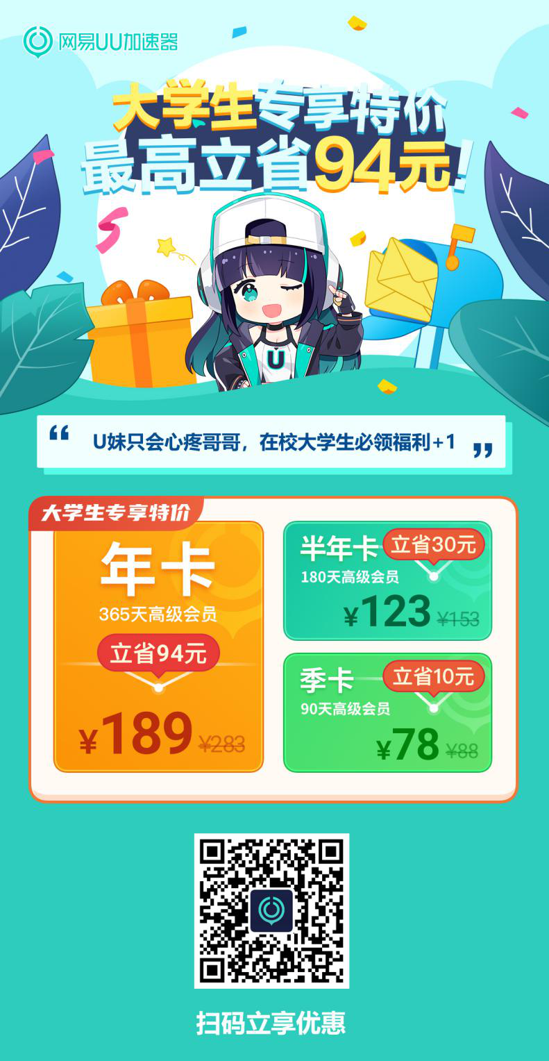 近日,《使命召唤》官方终于确认了《使命召唤18》将在年底发售的消息。根据官方介绍,游戏的开发由实力雄厚的大锤工作室负责,目前开发进展顺利,预计会在11月左右发售。《使命召唤18》以二战为背景,采用了架空时间线的设定,游戏中玩家不但能经历真实的历史事件,武器装备也能有更多选择。在游戏还未上线的时间里,大家可以继续游玩《使命召唤17》和《使命召唤:战区》,如果游戏出现延迟、卡顿等网络问题,可以使用网易UU加速器为游戏的运行网络加速,轻松摆脱这些问题的困扰。最近,网易UU加速器开启了面向大学生的专属打折活动,各位同学们快来看看吧。 想要参与这次活动,同学们需要扫描图中二维码进行学生身份认证,之后就可以参与进来了,购买季卡可以享受立省10元的优惠,购买半年卡则可以享受立省30元的优惠,而购买年卡可以享受到立省94元的巨大优惠,平均每天只需0.53元。 校园网的网速是供同学们日常学习所用,所以其网速较慢,如果想要在课余时间放松一下,与小伙伴们联机游戏或体验3A大作,校园网就很难满足。这时,可以使用网易UU加速器为游戏网络加速,凭借其行业领先的加速技术,显著减少游戏运行中的网络问题,大幅度提升游戏联网质量,让你享受高速、稳定网络环境带来的绝佳游戏体验。 网易UU加速器可以综合为游戏提速80%以上,0丢包,快速接入专线,一键即最佳,免去玩家设置节点的烦恼。同时网易UU加速器拥有500Gbps+的巨量带宽与7.5万个加速节点,覆盖200多个国家和地区,实现全球专线互联,让你随时享受稳定流畅网络环境。相信有了网易UU加速器,同学们一定可以享受到稳定、流畅的联机体验,下载游戏时也能轻松做到满速。 以上就是这次网易UU加速器推出的大学生活动的相关内容,同学们赶紧分享给需要的小伙伴,一起参与进来吧。 |