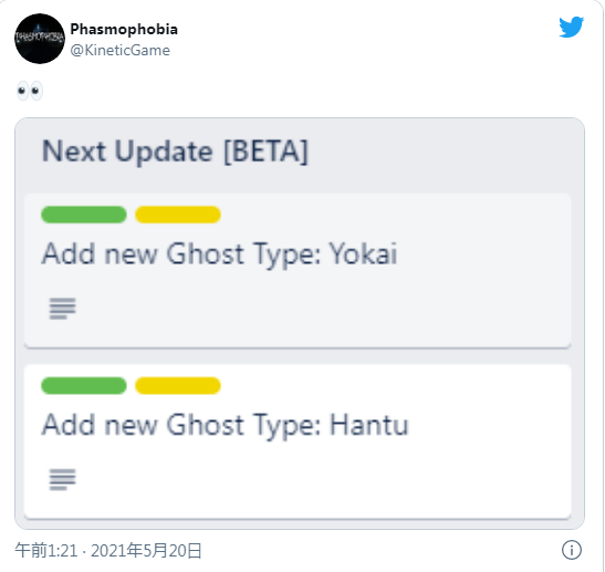 恐怖合作游戏《恐鬼症(Phasmophobia)》刚推出就备受玩家好评,目前这款游戏还在抢先体验阶段,官方会不断调整并推出新内容。今天开发商宣布将在beta版本的下一次更新中追加两种新鬼,分别是“Yokai(妖怪)”和“Hantu(汉图,印度尼西亚的精灵、幽灵)”。 妖怪 妖怪是会被人类的声音吸引的通常类型的鬼,出没在一户人家里。 特点:在Yokai附近发出声音的话妖怪会生气,攻击的可能性会变高。 弱点:在猎杀模式下Yokai只能听到附近的声音。 搜寻线索:指纹、灵球、通灵盒 汉图 汉图是在温暖气候下可以看见的罕见的幽灵。气温低的时候会频繁攻击。 特点:气温低的时候有可能以更快的速度移动。 弱点:在气温高的地方缓慢移动。 搜寻线索:指纹、灵球、通灵盒 虽然目前官方还没有告知具体更新时间,但官方推特账号上公布了相关截图,应该将在不久后推出,敬请期待。《恐鬼症》现已登陆Steam抢先体验平台,售价47元。 |