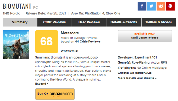 Experiment 101开发、THQ Nordic发行的开放世界ARPG游戏《生化变种(BIOMUTANT)》目前媒体评分已经解禁。该作在M站上的均分是68分,目前收录了44家媒体评分,大部分都给出了60分以上的评价。媒体认为该作虽然有可取之处,但任务设计等方面都不太理想,不能算一部优秀的作品。 GameSpace:95分。很久以来,第一次有一款游戏没有辜负(在我看来甚至是超过了)游戏发售前的炒作。坦白讲,如果《生化变种》不是年度最佳,我会非常失望。 Shindig:80分。简而言之,Experiment 101工作室提供了一场相当有野心的挑战。其重复的任务设计和低劣的叙事节奏使其注定无法成为同类游戏中的杰作,但令人振奋的战斗和相当有趣的探索激励仍旧算得上是一款不错的开放世界游戏。 SpazioGames:65分。《生化变种》在多个方面上的完成度都相当好,然而还需要多处打磨和大幅检修才能衬得上它的目标。整体的体验仍旧是令人愉快的。 GamesRadar+:60分。重复性、公式化的、不折不扣的怪异,《生化变种》受到大量问题的困扰,耽误了其新奇的设定。 Gamer.no:40分。《生化变种》是一款雄心勃勃的项目,然而其各个方面的表现都不够出色。有太多不可理喻的设计和令人不愉快的体验,这些都妨碍了游戏成为一款真正的佳作。 |