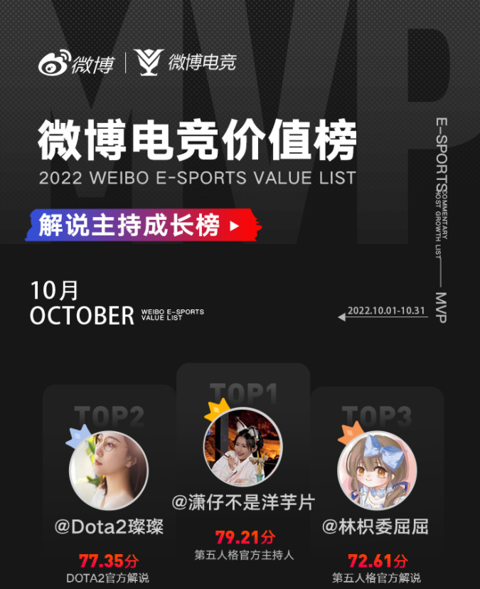 11月8日,微博电竞更新了10月份的微博电竞价值榜单,第五人格官方主持人、CC主播潇潇(@潇仔不是洋芋片)荣获解说主持成长榜第一名。潇潇从8月以来连续三个月霸榜,创下了登顶微博电竞价值榜的最长记录,潇潇已成为解说主持界一颗冉冉升起的新星。 (10月微博电竞价值榜更新 影响力成长榜TOP3) 微博电竞价值榜是由@微博电竞权威发布的一系列榜单,榜单会根据博主一个月内的账号博文互动量、发博量、总粉丝数、视频播放量、铁粉数等综合数据计算排名,榜单每个月都会更新一次。微博凭借其自身电竞产业链的完整布局和月活超5亿的用户规模,为用户们带了更加全面、多样和专业的总结,电竞价值榜可以是说对上个月的表现进行一次“复盘”。 连续三个月登顶 潇潇潜力无限 潇潇是网易游戏第五人格官方赛事解说、赛事主持人、CC直播平台第五人格头部主播,粉丝们喜欢叫她“潇仔”,全平台ID:潇仔不是洋芋片。潇潇以第五人格主持人的身份入围榜单,并且以79.21分的综合评分继续坐稳解说主持成长榜的榜首,排在潇潇之后的是DOTA2官方解说璨璨和第五人格官方解说林枳。在之前结束的8月、9月的解说主持成长榜中,潇潇都强势夺得第一名,本次更新了10月份的榜单之后,潇潇创下了连续三个月登顶的记录。 在去年的年度十大评选中,潇潇就获得了十大电竞解说排行榜第六名、十大解说主持成长榜的第一名,与潇潇同时上榜的则是LPL、KPL等主流大型赛事的知名解说和主持,第五人格主持人潇潇仍然能够从中脱颖而出,可见这份荣誉含金量十足。 曾登台《我是演说家》、《一站到底》 与第五人格电竞赛事共同成长 热门游戏IP《第五人格》于2020年举办首个非对称对抗竞技职业联赛,简称IVL,同时,IVL是中国大陆地区最高级别的第五人格职业比赛,是每年中国大陆赛区通往第五人格深渊的呼唤COA(Call of the Abyss)全球赛的重要通道之一。IVL发展迅速,发展至今,已汇集了十家国内职业俱乐部参赛,2022年IVL夏季赛总决赛的全网传播曝光量更是达到了惊人的40.2亿。 潇潇于赛事成立之初加入,现已主持了7次总决赛,150余场赛后采访和90多场综艺、访谈节目,受到粉丝喜爱。 潇潇拥有海外高学历,是中英双语专业的主持人。此前,CCTV1、北京卫视、山东卫视和凤凰卫视等多档语言类节目活动的中均有她的身影。她曾参加由共青团江苏省委、江苏资讯广播主办的首届青年演说家比赛,并获得冠军;在《我是演说家》中呼吁青年人用实际行动让世界听到中国声音;参加《一站到底》等综艺节目,均有亮眼表现。 有趣知心实力过硬 深受粉丝及品牌青睐 在职业赛事中,潇潇是一名业务能力非常强的主持人,而在CC直播平台中,潇潇则是一名多才多艺的主播,更是第五人专区的头部主播。在日常直播中,潇潇对于美妆、穿搭都有自己独到的见解,经常给年轻粉丝们分享自己的使用心得。同时,在游戏直播和第五人格赛后直播中,更会倾听粉丝的心声,照顾粉丝情绪,同时与大家分享第五人格赛事台前幕后小故事,是第五粉丝们心中的体贴又有趣的知心小姐妹。 除了深受粉丝喜爱,潇潇专业能力突出且有趣多才的潇潇也深受品牌方的喜爱。 刚刚过去的万圣节期间,潇潇化身旺旺糖果派发官,联合旺旺集团元气、YA-MI为粉丝们赠送价值超万元的糖果福利。 双11购物节前夕,潇潇化身好物推荐官,与LG生活健康展开合作,尝试游戏主播品牌专场带货直播,受到站内外粉丝广泛关注。 这样的成绩,离不开潇潇自身的的努力和CC直播一路的扶持,更离不开她热爱的第五人格电竞赛事与所有粉丝的支持。对潇潇而言,这既是肯定,也是鞭策。据知情人士透露,目前有许多知名品牌也向潇潇抛出跨界合作的橄榄枝,未来,潇潇会用怎么样的表现进一步回馈大家呢?让我们拭目以待。 |