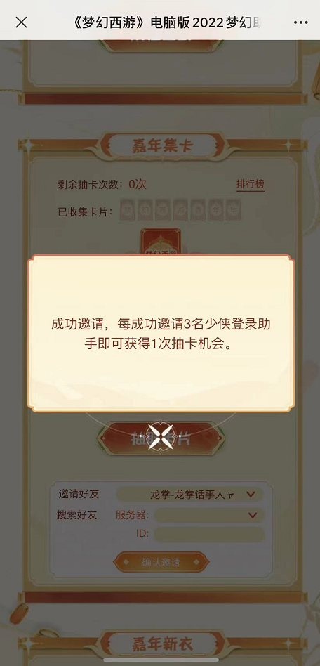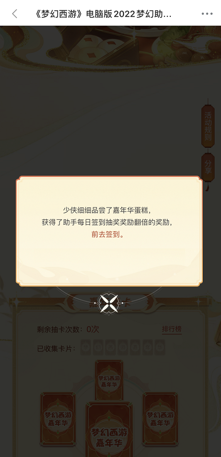 《梦幻西游》助手2022嘉年华活动进行中!从现在开始到2023年1月3日12:00前登录《梦幻西游》助手,等级≥30的少侠都能参与“嘉年蛋糕”、“嘉年集卡”和“嘉年新衣”三大活动,好礼多多,就等你参与啦! 为爱加码,解锁双倍签到奖励 正值嘉年华盛典之际,三界迎来新气象!在这样特殊且有意义的日子里,香甜的蛋糕自然少不了,少侠可以通过“细细品尝”、“大块朵颐”以及“生日快乐”三种方式与蛋糕进行友好互动。少侠品尝蛋糕完后,在《梦幻西游》助手参与每日签到抽奖时,可以获得buff增益,为你的欧气加码,幸运值UPUP! 活动期间,少侠每日登录《梦幻西游》助手参与抽奖,有机会获得游戏经验、周边礼品(大)、储备金、五宝盒、魔兽要诀等奖励。在加成之下,少侠们可获得2次抽奖机会,所获得的奖品也会变为双倍,比如抽到魔兽要诀就会得到2本,游戏经验也会变为双份。有了幸运buff的加持,相信大家都能拿到自己想要的好礼。 广邀好友快乐集卡,领取丰厚点卡奖励 在这个热闹非凡的嘉年华庆典之中,何不广邀三界好友来相会?在《梦幻西游》助手嘉年华活动“嘉年集卡”中,少侠可邀请三界好友共同参与,每日首次分享活动页面给其他好友,可以获得1次抽卡机会,每日仅限1次。同时,每邀请3名少侠登录《梦幻西游》助手可获得1次抽卡机会,该玩法每日不设上限。 当然,“嘉年集卡”的福利也是相当丰厚,最快集齐“梦幻西游嘉年华”7张卡片的少侠,且满足排名前20名的条件,可以获得200点赠点奖励。排名靠后的少侠,也不用担心没有好礼!只要少侠们集齐“梦幻西游嘉年华”7张卡片,就有机会获得100点赠点奖励(60名幸运儿)。 另外,活动期间将从全部登录《梦幻西游》助手的少侠中随机抽取5名少侠可获得2万点赠点奖励。玩法有趣,奖励丰厚,心动的少侠们别犹豫,也许那一个幸运儿就是你! 本次“嘉年集卡”活动中奖结果将于1月4日至1月10日期间抽取并公示,奖励领取时间为2023年1月10日维护后至2023年1月17日12时。游戏内的系统消息提醒界面,少侠们可要留意啦! 嘉年晒新衣,瓜分7500点卡 在《梦幻西游》助手内发布话题#共庆嘉年着新装# + 截图(锦衣/祥瑞穿搭)+ 理由,点赞超过20,即可参与“ 嘉年新衣 ”抽奖活动,随机抽取19名少侠可获得500点赠点奖励。数量有限,少侠们赶紧穿上新衣参加活动,将好礼带回家。 心动不如行动!《梦幻西游》助手2022嘉年华活动火热进行中,期待各位少侠的踊跃参加,尽享快乐时光! |