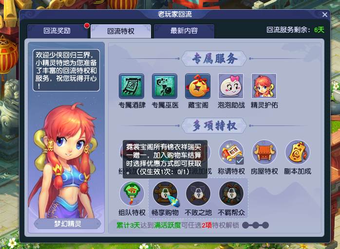 这周看到维护公告,发现梦幻西游的老玩家回流系统调整了。 作为一名特别喜欢卡回流,使用回梦丹刷储备金养号的梦幻西游玩家。 回流系统的迭代,还是让我挺好奇的。 于是我就上了一个许久没上的小号,来给大家探探路,看看新版的回流,和原来有什么不同? 回流以后,比较直观的第一感受,是回流界面和原来不一样了。 原版的回流,是直接给一个回流大礼包。现在的话,则是一张老玩家回流请柬,同时游戏左上角也有图标,可以直接点开,进入回流服务界面。 新版的老玩家回流服务,相较于旧版,增加了很多特权。 玩家可以随时随地召唤酒肆和超级巫医,相当于可以限时享受祥瑞技能服务。 对于没有酒肆、巫医等祥瑞技能的角色来说,拥有这两项服务,做任务时无疑可以方便很多。 另外,回流服务里面,还多了一项非常实用的回流专属藏宝阁。 打开藏宝阁,回流的玩家可以进入回流专属界面。 回流专属界面不仅可以对角色已经穿戴的装备进行免费估价,还可以为角色定制推荐装备。 对于阔别梦幻很久,对当今装备情况不是很了解的回流老玩家来说,角色若是没有合适的装备,就可以用这个定制推荐快速配装,非常方便且省心。 除了以上三项特别实用的回流特权服务外,新版回流的其他多项特权,也都非常实用。 例如[泡泡助战],做师门任务时,有超级泡泡在一旁协助战斗,好玩又实用。 [精灵护佑],角色每日与怪物的战斗中,正常阵亡时,将不会受到损失。 [房屋特权],可免费将房屋耐久和清洁度恢复到50。 而这其中,最吸引我的,就是累计3天满活跃度,可以解锁的[畅享购物]特权。 解锁这个特权后,霓裳宝阁所有锦衣祥瑞买一赠一,相当于5折就可以购买锦衣祥瑞。 这种福利,正常只有每年双十一活动的时候,玩家才能享受。 但现在,回流玩家只需累计三天满活跃度就可以享受啦! 不得不说,新版回流的这些特权服务,是真的顶啊。 而且新版回流的奖励方式,现在也迭代成了完成任务、累计活跃度即可领取。 完成每日活跃度的回流任务可以领取经验、储备金的奖励,达到100活跃还可以领取一次转盘奖励。 值得一提的是,每日活跃任务并非系统强制设定。 回流玩家可以根据自己的玩法喜好,自由设定自己当天计划要完成的任务。 也就是说,只要回来玩梦幻,你可以想玩什么玩什么,只要把这个任务设置成每日活跃任务,完成后就可以获得奖励。 真的是非常个性化。 此外,回流福利界面,还有着多项累计进度的任务。 完成以后,可以获得丰厚多样的可选奖励。 一边享受多种前所未有的回流特权,一边自由地畅玩梦幻,自由定制任务累计活跃度领取回流礼物,一边还可以累积活跃度享受锦衣祥瑞5折优惠。 新版的回流系统,整体给人的感官是福利更多,趣味性更强,且回流任务的自由度也更高了。 大家若是有许久没玩的号,强烈建议带着他重回梦幻,享受一下这全新的回流特权服务和福利! |