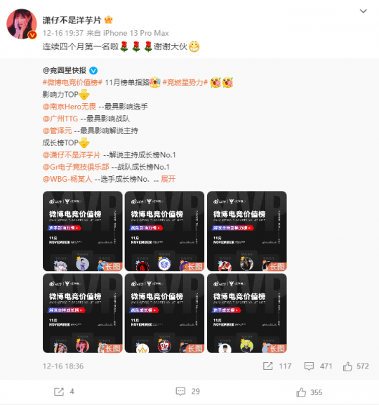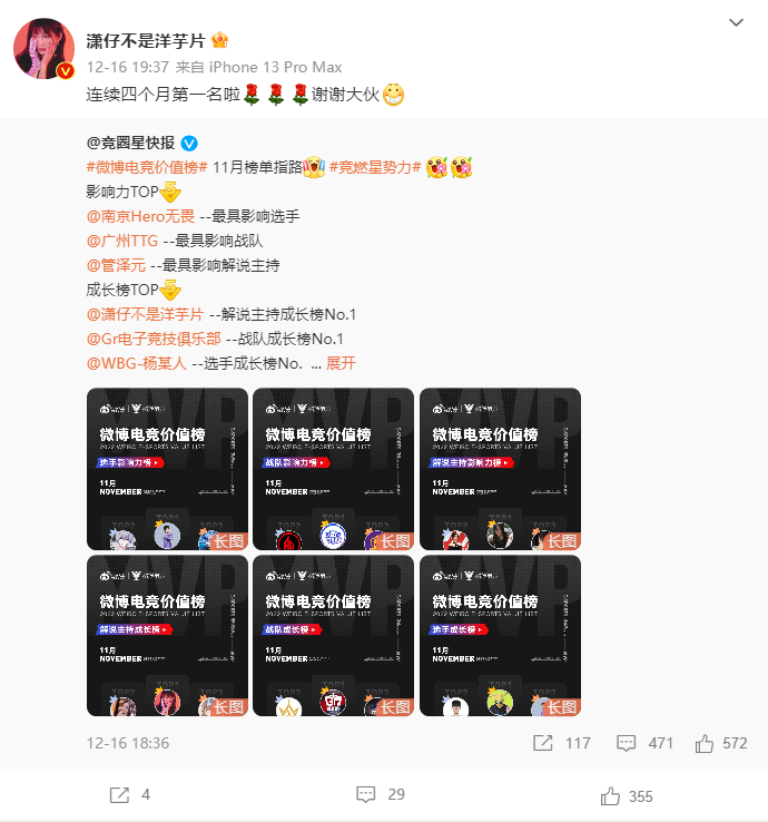 12月20日,一年一度的微博电竞大赏榜单公布,其中,在2022年度十大竞耀解说主持榜单中,第五人格官方主持人、CC直播平台主播潇潇(全平台ID@潇仔不是洋芋片)获得了十大解说主持第五名的好成绩,这也是潇潇第二次跻身年度前十,2021年她首次入围,并获得第六名。 潇潇脱颖而出,连续获奖 电竞大赏是由@微博电竞 权威发布的年度一系列十大榜单,这个榜单可以说电竞界的“奥斯卡”颁奖典礼。微博电竞大赏年度榜单包括:十大竞耀战队、十大竞耀选手、十大锋芒选手、十大竞耀解说主持、十大电竞媒体、十大电竞KOL、电竞价值赛事、电竞人气赛事和电竞突破赛事等多项奖项,包含了电竞选手、解说主持和电竞赛事。 本次计算方式分别按照博主投票数、活动期间(11.15-11.30)曝光量、11.30铁粉量,依次排名后分别给到0-100分,最终按照投票分数占比50%,曝光分数占比40%,铁粉量分数占比10%进行综合计算。潇潇以87.6分的综合评分获得了年度十大竞耀解说主持第五名。 今年竞耀解说主持上榜的有Gemini郭家毅、余霜、管泽元等英雄联盟、王者荣耀热门赛事的知名解说和主持,潇潇从中脱颖而出,也反映出其受欢迎程度非常高。 此外,在微博电竞价值榜-解说主持成长榜的月度评奖中,潇潇从8月份到11月份连续4个月登顶榜首,也创下了连续霸榜的最长记录。可以说今年是潇潇收获满满的一年。 台上双语霸气主持人,台下粉丝知心小姐妹 这两年以来,潇潇成为解说主持届的一颗新星,她的成长与第五人格赛事息息相关。第五人格于2020年举办首个非对称对抗竞技职业联赛(简称IVL),潇潇此时便以官方赛事解说、赛事主持人身份加入。如今IVL发展迅速,已汇集了FPX、微博、抖音等领域巨头组建的十家国内职业俱乐部参赛,2022年IVL夏季赛总决赛的全网传播曝光量更是达到了惊人的40.2亿。 潇潇的业务能力受到多方肯定,多次主持了开幕式、总决赛、赛后采访和综艺访谈节目,其中第五人格深渊的呼唤COA(Call of the Abyss)全球赛开幕式等,潇潇使用中英双语主持,气场全开。 除赛事主持外,潇潇还是网易CC直播平台签约的第五人格头部主播,粉丝们喜欢称呼她为“潇老师”。在游戏直播和第五人格赛后直播中,潇潇会倾听粉丝的心声,照顾粉丝情绪,还会与大家分享第五人格赛事台前幕后小故事,她笑称自己是IVL的“男妈妈”。近期,IVL电竞选手的发型成为圈内热议话题,潇潇带着狼队487、狮子等选手进理发店,逐步拯救全联盟的“锅盖”,粉丝们亲切地称呼她为“IVL发型之母”。 懂美妆,会穿搭,多重跨界,潇潇技能点全开 潇潇是第五粉丝们心中的体贴又有趣的知心小姐妹,在CC的日常直播中,潇潇对于美妆、穿搭都有自己独到的见解,经常给粉丝们分享自己的使用心得。 今年潇潇能取得这样的成绩,离不开潇潇自身的的努力和CC直播一路的扶持,在CC直播平台的帮助下,潇潇与LG生活健康、旺旺、Choli等品牌等展开合作,为粉丝们带来丰富的福利。 近日,潇潇化身CC直播游戏领航员,与百度地图合作,推出了潇潇X百度地图语音导航,融合潇潇个人特色与游戏梗,于12月22日正式上线。 让我们恭喜潇潇获得2022年度十大竞耀解说主持,期待来年潇潇能给支持她的粉丝们带来更多的惊喜! |