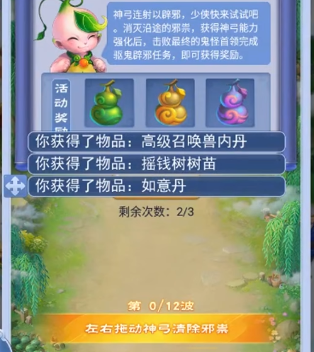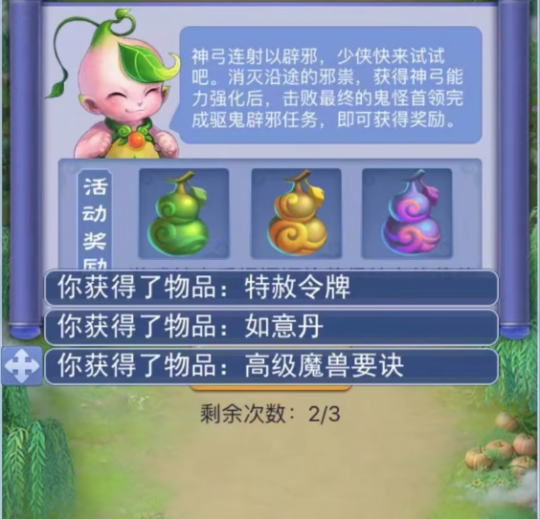 2023年清明节活动于2023年4月4日12:00-2023年4月10日12:00全服开启。本次清明节活动除了有端游丰富的活动,还有不少口袋版玩法。今天,就给大家介绍下2023年清明节口袋版中神弓辟邪的攻略。 玩法非常简单,尽可能的提高神弓的威力,并尽可能多清除邪祟。最后可获得的奖励,根据玩家清除邪祟的种类、数量的评分相关。 奖励,可以分为3个档次。其中,奖励最好的非紫晶葫芦莫属。 每个邪祟所附带的属性,各有不同。将其清除之后,神弓就会获得这个属性。 建议:首先清除箭矢+1的邪祟,这样神弓射出的箭就会增加。之后,便是攻击+1。当然了,射程也很关键。 最好的情况,就是同时获得3个紫晶葫芦。 如果在游戏的过程之中,不小心碰到了未被清除的邪祟的话,那么游戏结束。同时,根据评价获得相应想奖励。 如果本局获得葫芦类型没有达到心中的要求的话,玩家可以选择重开本局。 上面的截图是同区的小伙伴发来的,这奖励也太香了吧?于是,玩家决定亲身体验一把。接下来,就给大家晒晒玩家在参与这个玩法时都获得了哪些奖励吧? 第1个号的奖励,似乎跟玩家所想像的有些不太一样。幸好,珍珠的等级比较不错。不然,玩家恐怕就是出师未捷身先死。当然了,毕竟才刚刚开始,权当铺垫。后面还有机会,不慌。 第2个号,虽然玩家如愿以偿的将五宝收入囊中。但是,五宝的种类却让人不忍直视。哎,难受。 第3个号,居然拿到了两个宝石。说好的高级召唤兽内丹呢?说好的高级魔兽要诀呢?哪怕来个特赦令牌也可以啊? 第4个号,玩家终于如愿以偿的将高级召唤兽内丹收入囊中!但是,此时高兴未免有些为时尚早。毕竟这个高级召唤兽内丹所携带的技能,才是关键。 要知道,虽然高级召唤兽内丹一共有17种。但是,其中受玩家喜欢的种类却是屈指可数。因此,这个结果并没有出乎玩家的预料。 玩家用自己的实力证明了一件事,那就是同人不同命!哎,心疼玩家。 值得注意的是,每位玩家每天可以领取3次奖励。因此,建议3个都是紫晶葫芦的时候再进行开启。 |