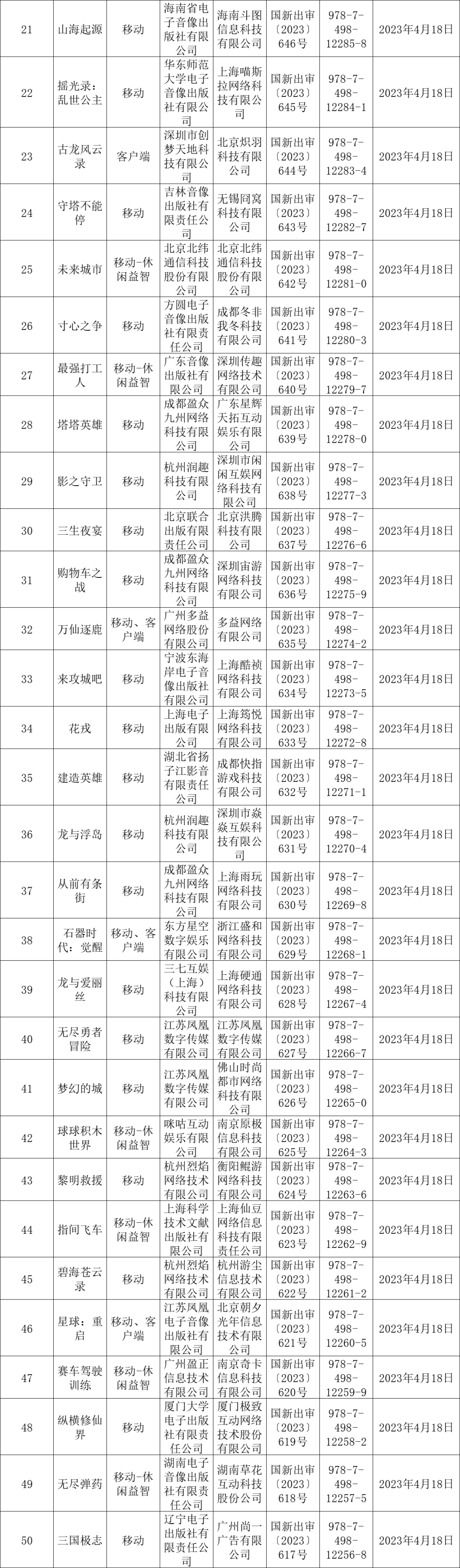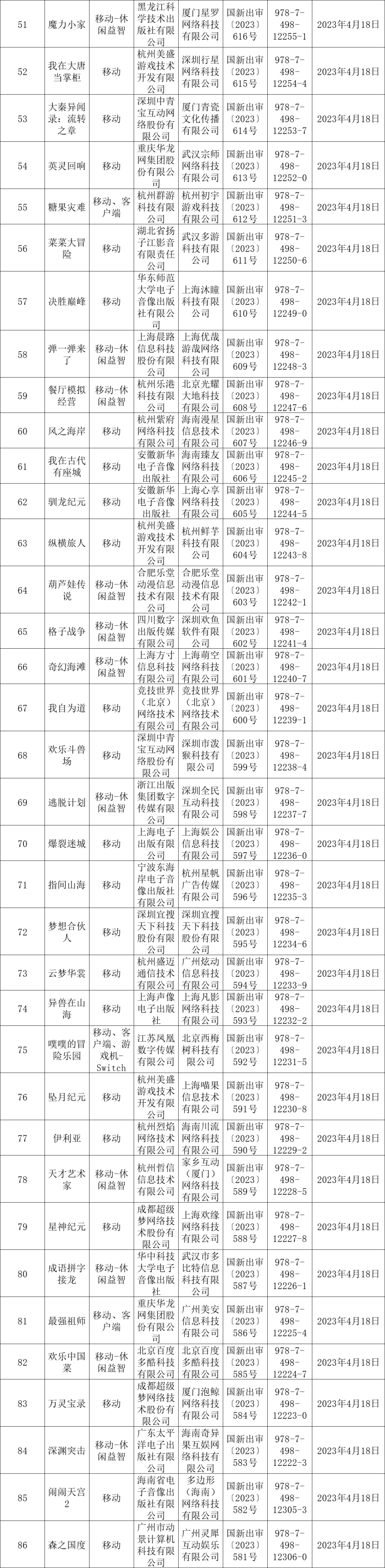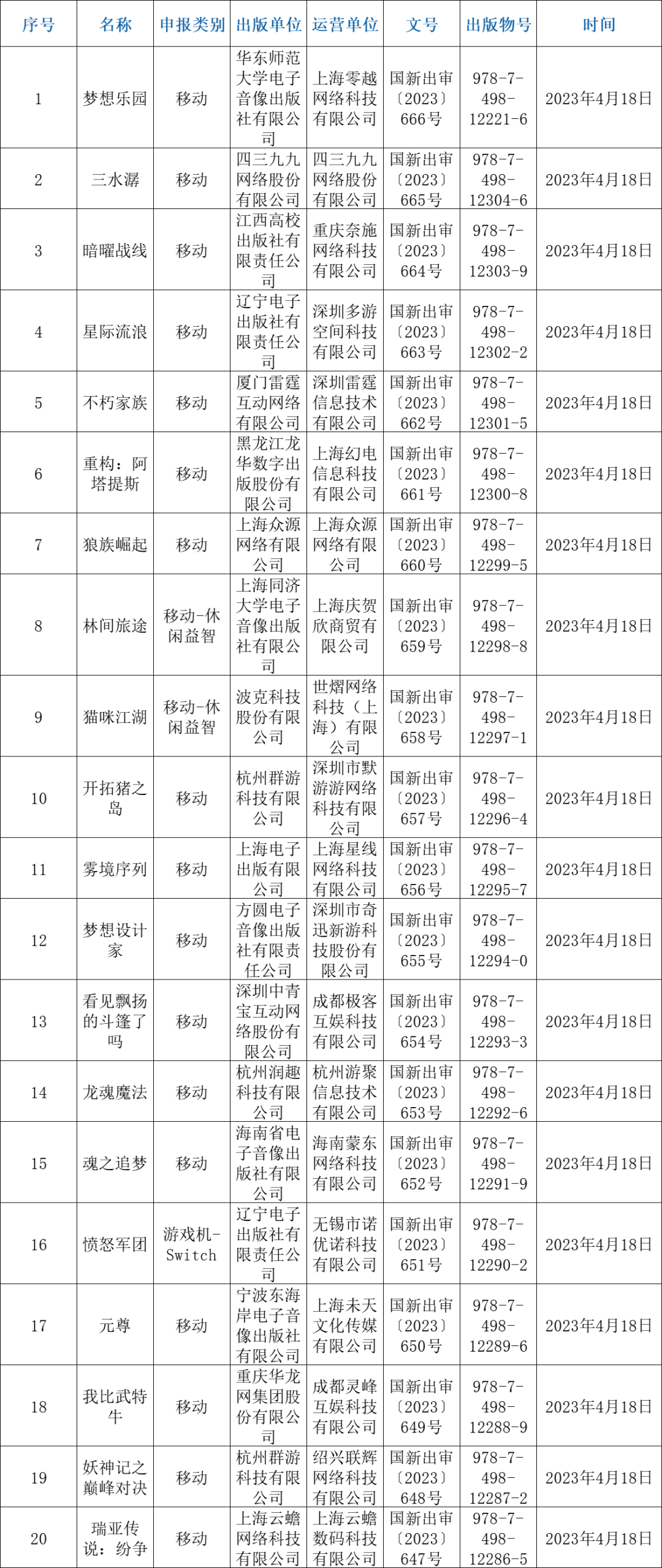 4 月 20 日,国家资讯出版署在官网公布了新一轮国产游戏过审版号,这是2023年的第四批版号。 本次共有86款游戏过审,其中纯移动游戏共78款、纯客户端1款、纯Switch 1款,另外5款同时申请了移动和客户端,以及1款同时申请了移动、客户端和Switch端。 本次获得版号游戏,有多款重量级产品,包括但不限于:沐瞳科技《决胜巅峰》、四三九九《三水潺》、雷霆游戏《不朽家族》、bilibili《重构:阿塔提斯》、波克城市《猫咪江湖》、中青宝《看见飘扬的斗篷了吗》、《欢乐斗兽场》、创梦天地《古龙风云录》、星辉天拓《塔塔英雄》、多益网络《万仙逐鹿》、三七互娱《龙与爱丽丝》、咪咕互娱《球球积木世界》、朝夕光年《星球:重启》、极致游戏《纵横修仙界》、青瓷游戏《大秦异闻录:流转之章》、百度多酷《欢乐中国菜》、灵犀互娱《森之国度》、恺英网络《石器时代:觉醒》等等。 随着这些新一批版号的发放,国内游戏市场在多个领域将迎来新的入局者。 比如MOBA领域有沐瞳科技的《决胜巅峰》。众所周知,沐瞳科技凭借《Mobile Legends: Bang Bang》成为海外MOBA领域的头部厂商,在MOBA领域的运营经验不可谓不丰富。不过在国内市场,面对MOBA领域的绝对霸主腾讯,能否“虎口夺食”呢?相信待这款游戏上线后会自动揭晓答案。 朝夕光年旗下MMC工作室研发的科幻题材的开放世界生存游戏《星球:重启》也顺利拿到“通行证”。这款手机和客户端共通的游戏,已经率先在海外上线,当前国服版在TapTap的评分分别为8.7分和8.8分,两个平台的预约数累计超过180万。 SLG领域也有新的入局者,众源网络获批的《狼族崛起》猜测是《Wolf Game: The Wild Kingdom》的国服版。《Wolf Game: The Wild Kingdom》去年8月25日在海外上线,由成都新奇互娱(Special Gamez)发行,而新奇互娱的背后厂商是爱奇艺,众源网络的老板又正是爱奇艺的实控人龚宇。随着蚂蚁题材的SLG进入国内市场,这款去年在SLG赛道崭露头角的狼题材产品是否同样能在国内开拓一片市场呢?这也将成为行业关注的话题。 三七互娱的《龙与爱丽丝》是一款魔幻战旗策略类移动网络游戏,在游戏中,玩家扮演一名异世界时空特遣队的预备指挥官,通过征召来自不同时空的人物组成时空特遣队前往处理时空危机事件;除了在时空危机之中进行磨炼,玩家们还可以通过挑战远古巨像、探索先行者之塔,来提升时空特遣队的实力;还可以加入联盟,与其他玩家进行友好的互动交流,提高交流能力。 另外,二次元题材也有令人期待的作品,如灵犀互娱的《森之国度》、星线网络《雾境序列》,前者目前透露的资料不多,据悉是拥有放置玩法的游戏,后者则是策略RPG游戏。 以下是具体过审游戏名单: ChinaJoy 自 2003年首次举办以来,ChinaJoy 不断拓展创新,从单一游戏产业展览会,发展到数字娱乐产业展览会,积极服务我国数字娱乐产业有序、健康、持续发展。经过近二十年的持续蓬勃发展,ChinaJoy 线下展会,累积沉淀了近五六百万 Z世代用户;线上关注 ChinaJoy 的 Z世代人群,品牌影响力触达数亿用户;累计参展参会企业一千余家,其中涵盖了众多的行业领袖级企业和世界 500强企业。发展至今,ChinaJoy 展览会在世界数字娱乐产业展览会中,极具知名度与影响力;展会规模,更达到全球第一;同时作为国内第一个覆盖数字娱乐各个领域的全球性产业交流与合作平台,如今已家喻户晓。 第二十届 ChinaJoy 展会以“相伴二十载越来悦精彩”为主题,感恩二十年来一路同行的所有海内外业界伙伴和玩家朋友们;期待相聚 2023年,共同见证ChinaJoy 辉煌的二十周年盛典。展会将于 2023 年 7 月 28 日至 7 月 31 日在上海新国际博览中心举办,同期 CJPlus(ChinaJoy线上展)也将迎来其全新形态,开启“线下+线上”的多元化数字娱乐嘉年华模式。 2023 ChinaJoy BTOC 互动娱乐展示区是面向广大玩家展示游戏(手游、网游、端游、页游、H5 游戏、小程序游戏、创意游戏、桌游、云游戏、VR/AR游戏等等)、电子竞技、短视频、互联网影视、互联网音乐、网络文学、直播、社交平台、APP、智能娱乐软件、智能娱乐硬件等数字娱乐产业前沿产品的互动娱乐展示区,汇集数千款全球顶级游戏大作、数千台游戏体验机及数字娱乐和智能娱乐软硬件,带来强劲的数字娱乐体验风暴。展会四天入场总人数,预计将达到数十万人次。从展会规模、国际化程度和全球影响力等各项指标来看,ChinaJoy 展览会已超越德国科隆游戏展、美国 E3 游戏展、日本东京电玩展、韩国 GSTAR 游戏展等全球众多数字娱乐国际性展览会。 2023 年恰逢 ChinaJoy 二十周年,展会现场,必将盛况空前。海内外游戏厂商将云集于此,通过技术和产品展示的形式,让广大游戏爱好者了解来自国外的最新游戏大作,零距离精彩体验。作为全球数字娱乐企业进行产品展示并与广大数字娱乐爱好者开展现场互动的最佳平台之一,2023 ChinaJoy 将集聚二十年品牌影响力、广泛的跨界合作功能、强大的媒体宣传优势,呈现给大众更加精彩的一届数字娱乐产业盛会! 2023 年第二十届 ChinaJoy 展会招商工作如火如荼!自 2022 年底正式启动以来,海内外业界企业,报名积极踊跃,可谓群星璀璨。短短时间内,本届ChinaJoy BTOC 展区已预定的参展企业达到数百家,BTOC 展区预定的总面积已超过 80000 平米。海内外业界头部企业悉数参展;游戏版号恢复发放且数量增势喜人,更助推广大