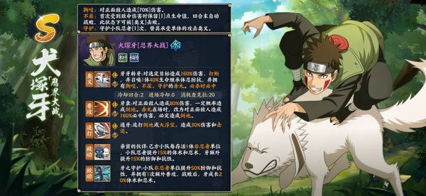犬塚牙是木叶隐村犬塚一族的族人,每位犬塚族人在小时候都会拥有一只忍犬,牙的忍犬则是赤丸。无论是在生活中还是外出执行任务,他们都形影不离,如同兄弟一般。 犬塚牙从忍校毕业后,进入了第八班——夕日红小队。牙总是充满着活力,十分重视同伴之间的羁绊,在执行任务中会特别照顾同伴,是一个特别温柔细心的人。 赤丸则是犬塚牙的得力和忠心的助手,在执行任务时,赤丸可以起到优秀的辅助作用。牙擅长犬塚流人兽混合变身术以及与赤丸的合击忍术牙通牙等。 如今全新S级忍犬塚牙[忍界大战]登录《火影忍者:忍者新世代》! 忍法·四脚之术!要上了,赤丸! 犬塚牙与赤丸配合使用忍术,以三头狼形态进行横向高速旋转突进,可以轻松撕裂多数的敌人。 奥义:牙牙转牙:对选定目标造成160%伤害、打断,并召唤1体40%生命继承体忍防抗,并拥有撕咬、不屈、守护的赤丸。必杀时必中。 普攻:牙袭:对正面敌人造成80%伤害,一定概率造成倒地。赤丸在场时,改为对正面敌人造成160%必中伤害,必定造成倒地。 犬塚牙发明了牙通牙单体版,自身高速旋转攻击敌人。在攻击次郎坊的土遁·土牢堂无和带土时都曾使用过。 追打:通牙:追打倒地或大浮空,造成30%伤害和击退。 犬塚牙非常关心自己的伙伴们,对赤丸也十分地关心和保护,在遇到危险时,牙会毫不犹豫的挺身而出。 赤丸小时候会趴在牙的头上,或是被装在衣服里。当赤丸成长到比人还大时,体格健壮的赤丸能让牙骑在它的背上,共同执行任务。 被动Ⅰ:亲密的伙伴:己方小队每存活1体非忍者单位,小队忍者提升15%的体术和忍术,牙额外提升15%的防御和抗性。 被动Ⅱ:牙之守护:小队非忍者单位提升50%防御和抗性,并拥有1次额外普攻,战败后,牙成长20%体术和忍术。 在第四次忍界大战中,犬塚牙担任忍者联军第五部队成员,犬塚牙认为如果能在忍界大战有出色表现的话,说不定能有当上火影的机会。他的姐姐犬塚花却认为牙过于将战争当成儿戏看待,并出言劝谏他。 如今《火影忍者:忍者新世代》全新S级招募忍者,犬塚牙[忍界大战]来袭,鸣人和佐助都以火影为目标,我也要大步迈向火影!快来助我一臂之力吧! |