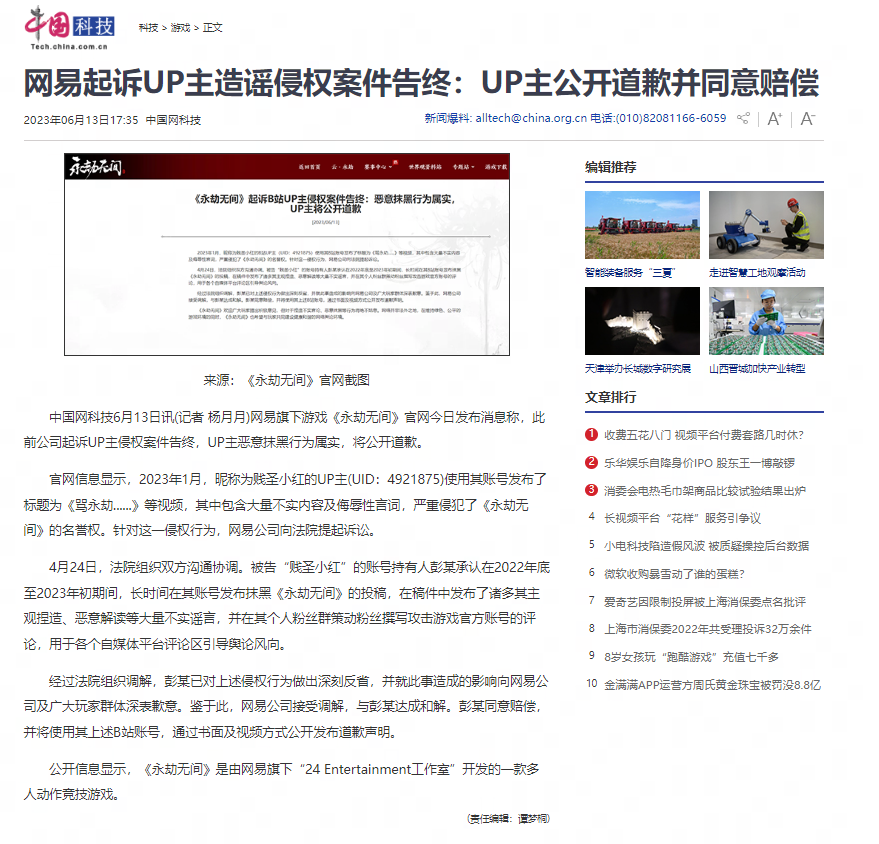 近日,中国网等多家官媒发布了一则资讯。 2023年1月,昵称为贱圣小红的B站UP主(UID:4921875)使用其B站账号发布了标题为《骂永劫......》等视频,其中包含大量不实内容及侮辱性言词,严重侵犯了《永劫无间》的名誉权。针对这一侵权行为,网易公司已向法院提起诉讼。 4月24日,法院组织双方沟通协调。被告“贱圣小红”的账号持有人彭某承认在2022年底至2023年初期间,长时间在其B站账号发布抹黑《永劫无间》的投稿,在稿件中发布了诸多其主观捏造、恶意解读等大量不实谣言,并在其个人粉丝群策动粉丝撰写攻击游戏官方账号的评论,用于各个自媒体平台评论区引导舆论风向。 经过法院组织调解,彭某已对上述侵权行为做出深刻反省,并就此事造成的影响向网易公司及广大玩家群体深表歉意。鉴于此,网易公司接受调解,与彭某达成和解。彭某同意赔偿,并将使用其上述B站账号,通过书面及视频方式公开发布道歉声明。 《永劫无间》官方在发布的资讯中也表示,欢迎广大玩家提出积极意见,但对于捏造不实言论、恶意抹黑等行为将绝不姑息。网络并非法外之地,在维持绿色、公平的游戏环境的同时,希望能与玩家共同建设健康和谐的网络舆论环境。 在当下,必须让“自媒体”人意识到互联网不是法外之地,网上发布内容也需要负法律责任;让社会大众意识到应该杜绝造谣传谣、标题党、蹭流量、网络暴力等行为,才能让不好的“自媒体”逐渐被社会淘汰,还大众一个风清气正的网络环境。 |