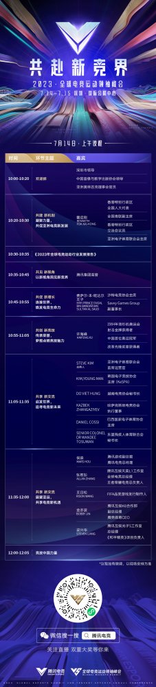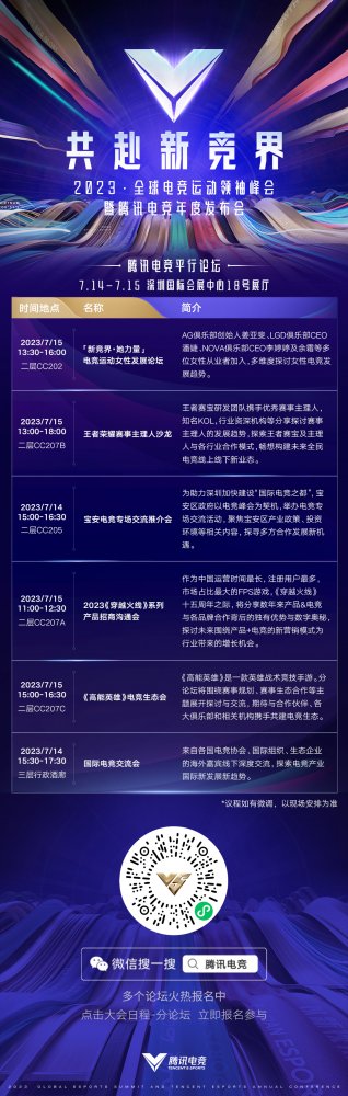 由中共深圳市委宣传部、深圳市文化广电旅游体育局、中国音像与数字出版协会电竞工委指导,腾讯电竞主办的2023年全球电竞运动领袖峰会暨腾讯电竞年度发布会将于2023年7月14日至15日在深圳国际会展中心举行。 本次大会共计两天,由全球电竞运动领袖峰会、腾讯电竞年度发布会、行业系列分论坛组成。 01全球电竞运动领袖峰会 全球电竞运动领袖峰会将于7月14日上午举行,将有霍启刚、许海峰、沙特费萨尔王子、腾讯高管等重磅嘉宾到场参与,从多个视角探讨电子竞技的发展与交流合作;腾讯四大入亚电竞项目筹备进展分享,将带来以更充沛姿态、更高标准奔赴亚运赛场的最新消息;更有来自韩国、越南、巴西、哈萨克斯坦、东盟等多个国家电竞协会和体育组织的代表同台共聚,共同探讨国际化背景下,各国电竞发展的新方向、新探索。 02??腾讯电竞年度发布会 7月14日下午举行的腾讯电竞年度发布会,腾讯电竞将携赛事业务及电竞产品业务负责人,发布2023腾讯电竞产业领域的整体思考和发展策略,分享11项赛事发展新规划,内有2大重磅新赛事亮相登场!以多元电竞业态的思考规划和赛事技术的升级落地,与行业伙伴共同探索属于中国电竞的新竞界、新可能。 03??系列分论坛探讨电竞产业关键突破 会议期间,将举行包括【新竞界·她力量】电竞运动女性发展论坛、王者荣耀赛事主理人沙龙、深圳市宝安区电竞专场交流推介会、?2023?《穿越火线》系列产品电竞招商沟通会、《高能英雄》电竞生态会、国际电竞交流会等多个分论坛与沙龙,聚焦赛事及产业议题,推动电竞产业纵深发展。 2023年7月14日-15日 深圳国际会展中心 全球电竞运动领袖峰会暨腾讯电竞年度发布会 等待与您相聚! 也可扫描二维码,小程序线上观会 鸣谢以上合作伙伴对本次大会的大力支持 |